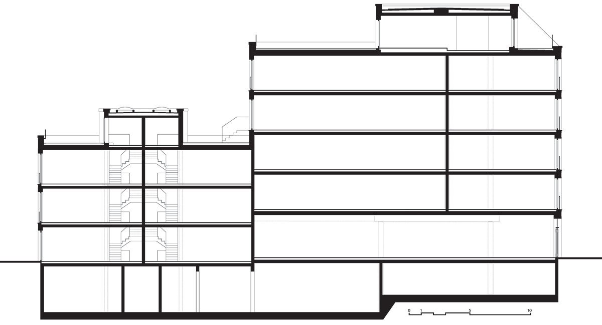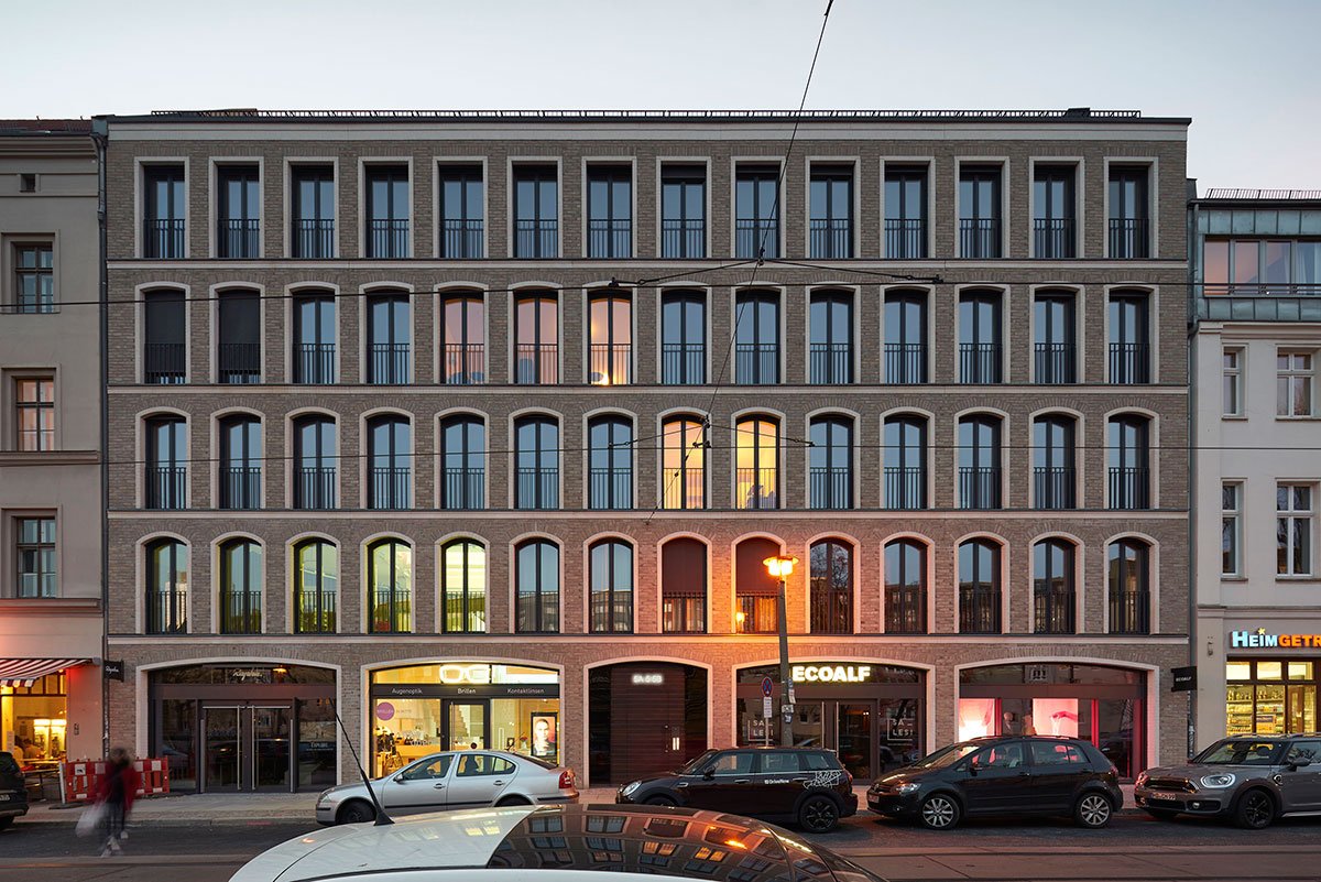 Both street sides are clad with Egernsunder clinker in warm, slightly shimmering beige. The five-storey building on the Alte Schoenhauser is structured very clearly by arched windows. Different heights of the arches enrich the façade tectonics: significant in the first floor the arches flatten to the top, and finally the last floor as well as the penthouse has rectangular windows. In the ground floor retail spaces are well presented inside the generous window openings.
