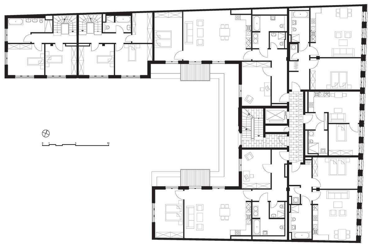 The new residential ensemble was developed on a former gap between the two streets Alte Schoenhauser Strasse and Rueckerstrasse closing the block perimeter. The construction refers to the historical development taking in the spirit of the Gruenderzeit. The former existing building which was located on this plot had a clear grid and a classicist, elaborately shaped façade.