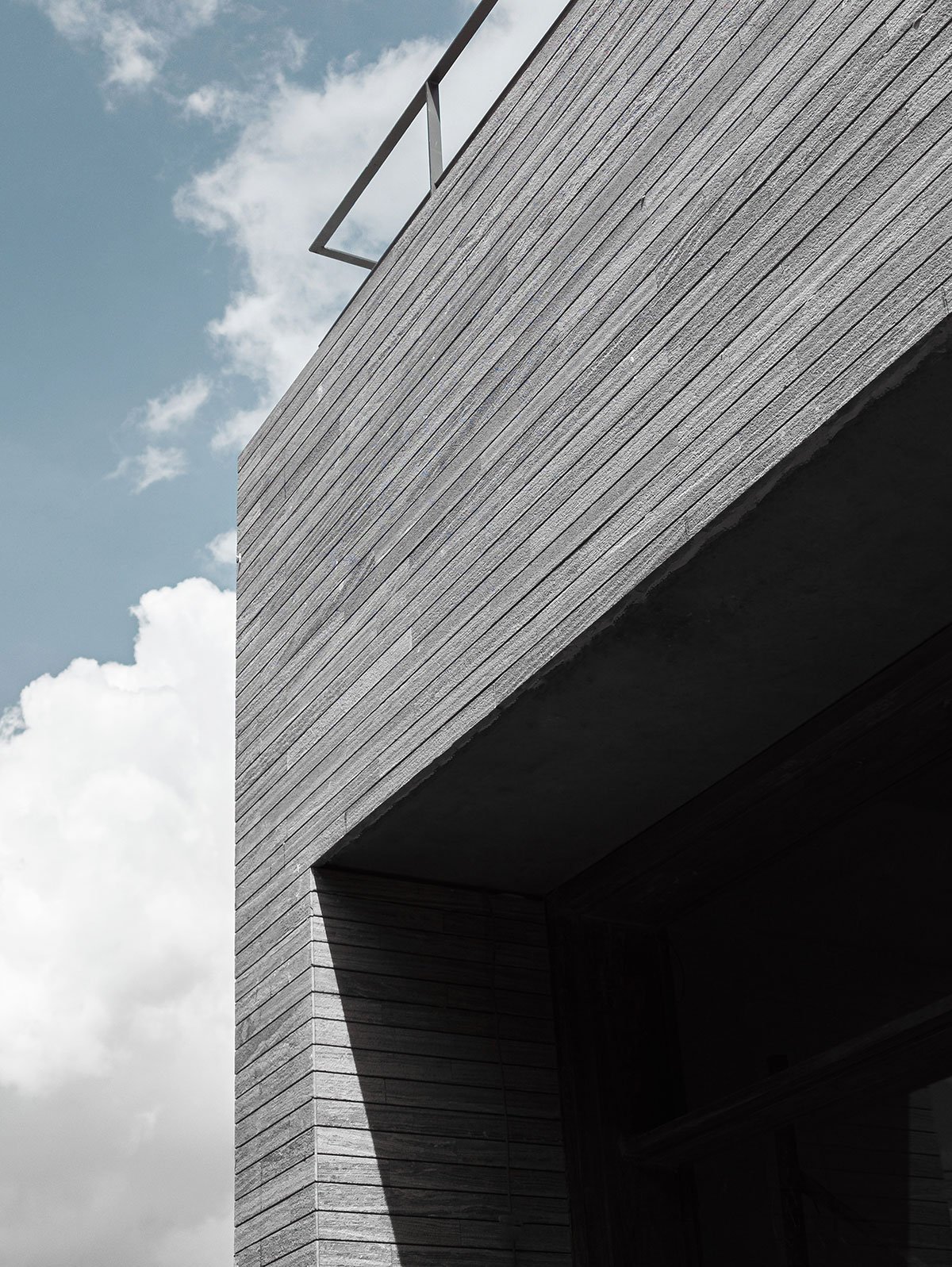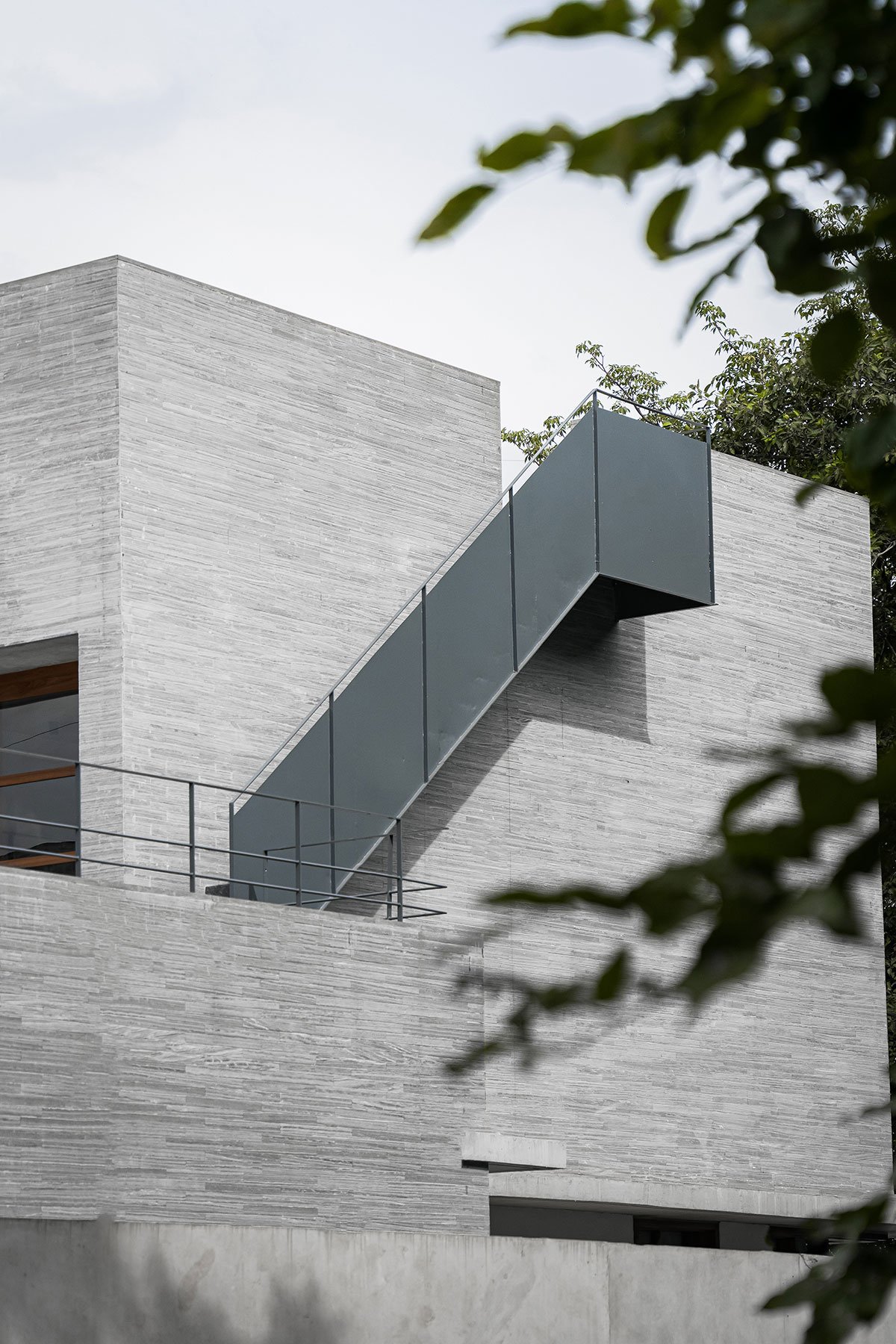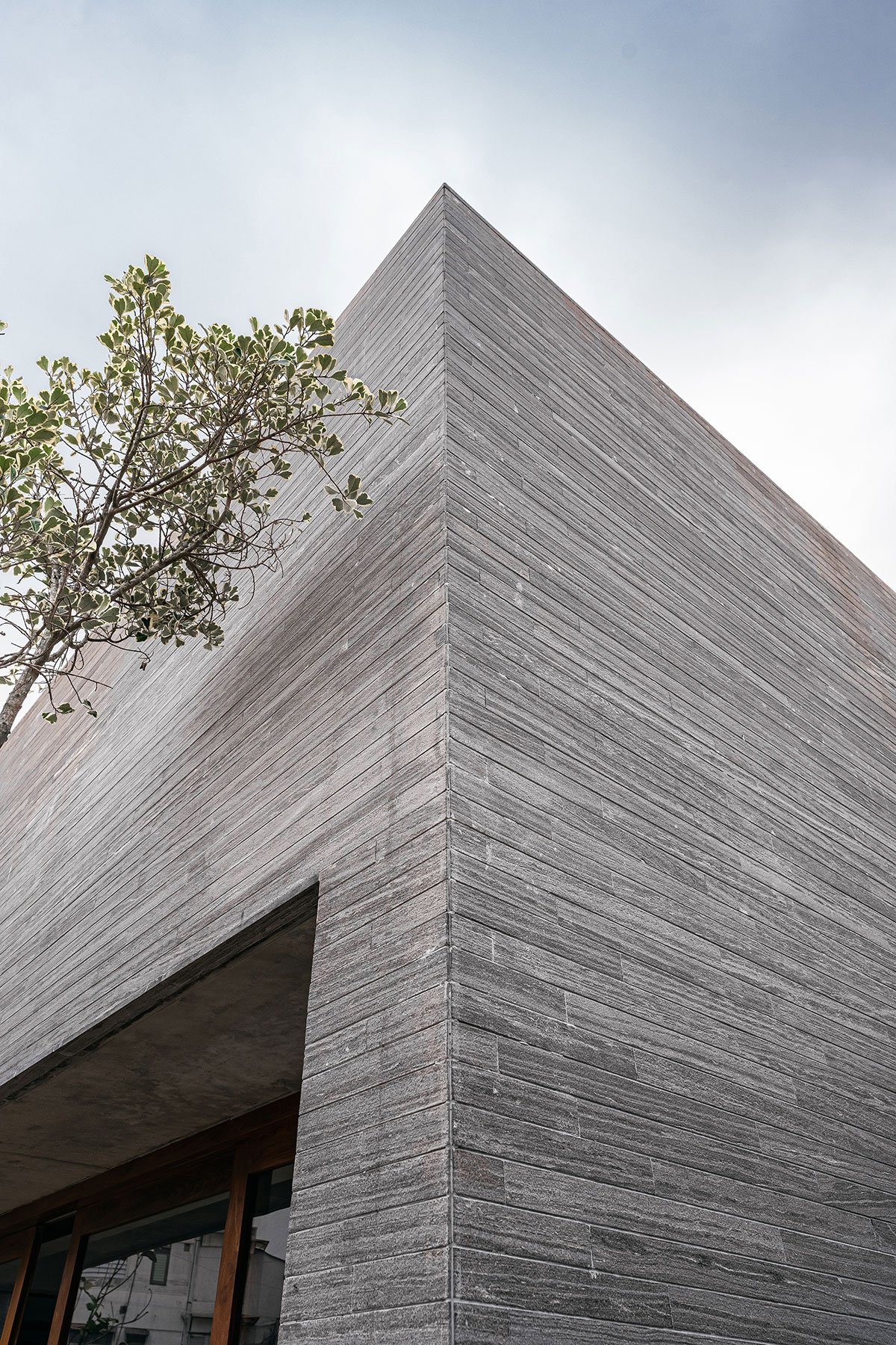 Materiality & Craftsmanship: The studio’s exterior is clad in thin strips of neutral-toned natural stone, imparting a monolithic yet tactile character. Sleek metal doors, wooden windows, and form-finished concrete slabs form a cohesive material palate, balancing raw textures with refined simplicity. Inside, whitewashed walls temper the earthy warmth of the façade, ensuring a neutral backdrop that accentuates the exhibited artwork.