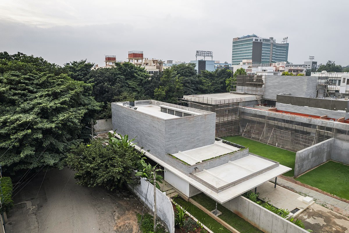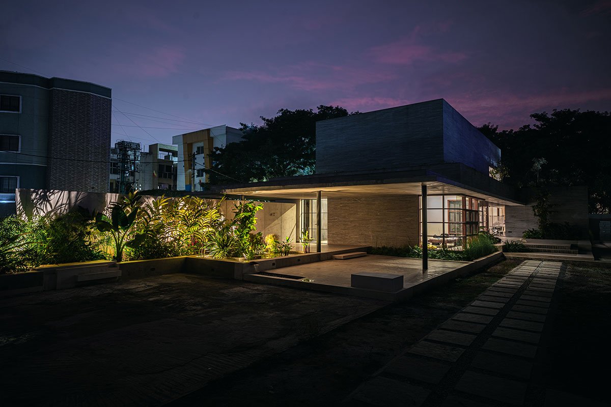 A form-finished concrete slab hovers over the entrance foyer, creating an intimate arrival experience. A 40-foot-long form finished wall, accompanied by a landscaped water body, forms a serene backdrop, extending outward to enclose a small open-air theatre (OAT) at the southeast corner.