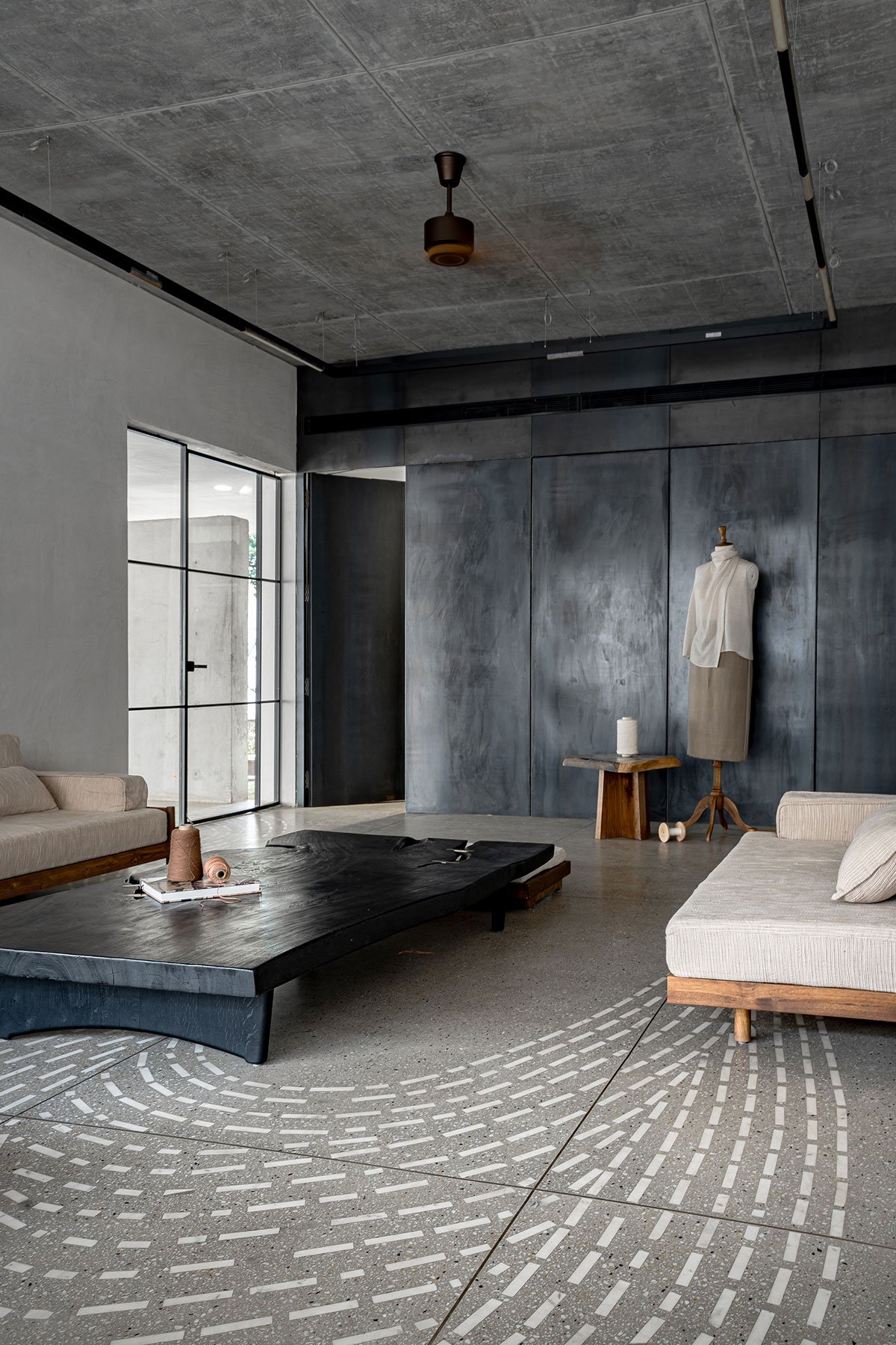 Terrazzo flooring extends throughout the space, reinforcing the studio’s rugged yet timeless aesthetic. A delicate inlay of flowing white marble, mimicking the stitches on a tapestry art work we had encountered, traces a meandering path across the floor, subtly mirroring the undulating motion of fabric as it unfurls—a poetic nod to the art of weaving. Beyond its aesthetic appeal, this marble path serves as an intuitive guide, leading visitors through the space in a rhythmic, organic flow.