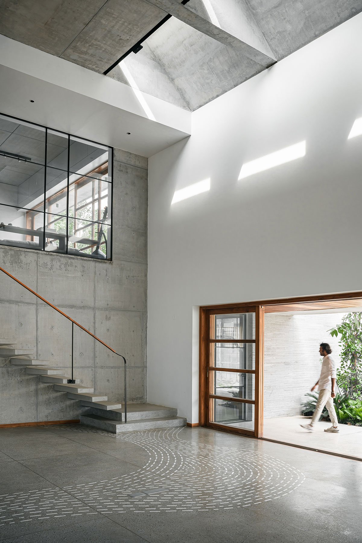 A cantilevered RCC stair, positioned along the western edge of this hall, ascends to the upper level, which houses Client’s personal workspace and a gallery for her paintings. The workspace extends onto a deck, forging a seamless connection between the interior and exterior.