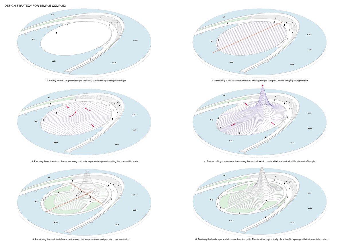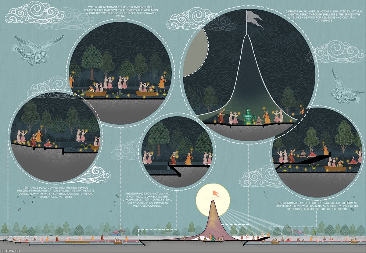 The proposal seeks to rethink the new temple form resonating with the existing ones. An urban activator, rejuvenating the urban spaces by reimagining spatial elements of an ancient Hindu temple, facilitating socio-cultural, religious and recreational activities.