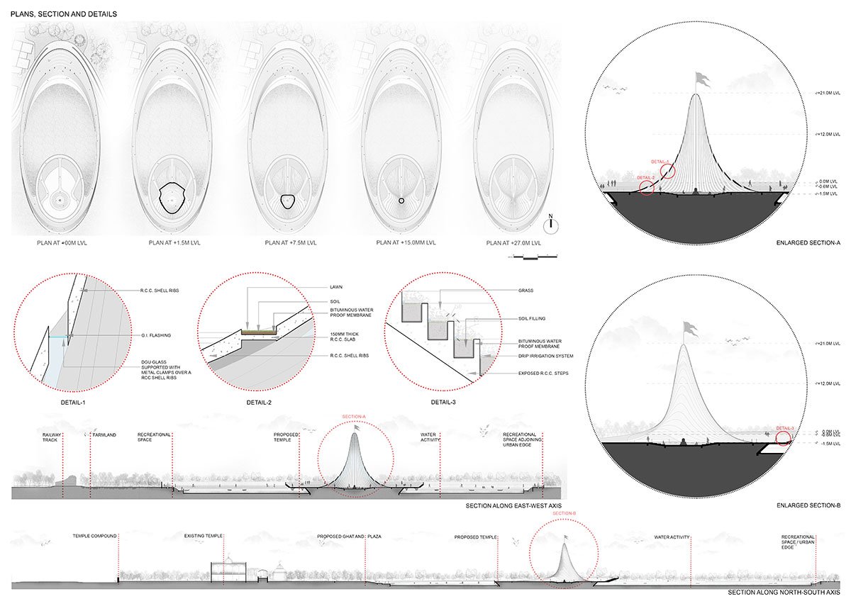 Primarily, the connection between both temples is devised through an elliptical bridge, which enables direct visual contact from the existing temple. The parabolic edges of this elliptical bridge are altered to form a ‘Ghat’ at the entrance, which helps to expedite public and religious activities. While the opposite edge acts as an amphitheatre with the top layer as a viewing gallery. The centrally located water body confined by an elliptical bridge acts as ‘Kund’ – a water reservoir as referred to in ancient temples, which helps facilitate recreational water activities.