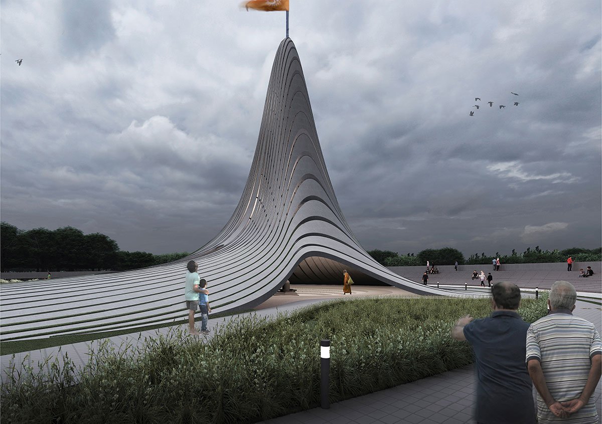 The entrance plaza implies ‘Ardhmandapa’- A transition space in Hindu temples that frames both temples. The visual lines are projected onto the site imitating the ripples generated in the lake as the wind sways are further pinched and pulled, as a result, the structure rhythmically lifts itself from the ground to form ‘Shikhara’- a spire or tower in ancient temples. These sinuous shell ribs symbolize the mountain ranges, with a cave-like formation where Lord Shiva dwells. Puncturing the peripheral ribs defines an entrance to the burrowing space ‘Garbhagriha’ – An inner sanctum where an idol of a deity resides. The spacing between these ribs helps light to penetrate within, while the peripheral entrances permit excellent cross ventilation.