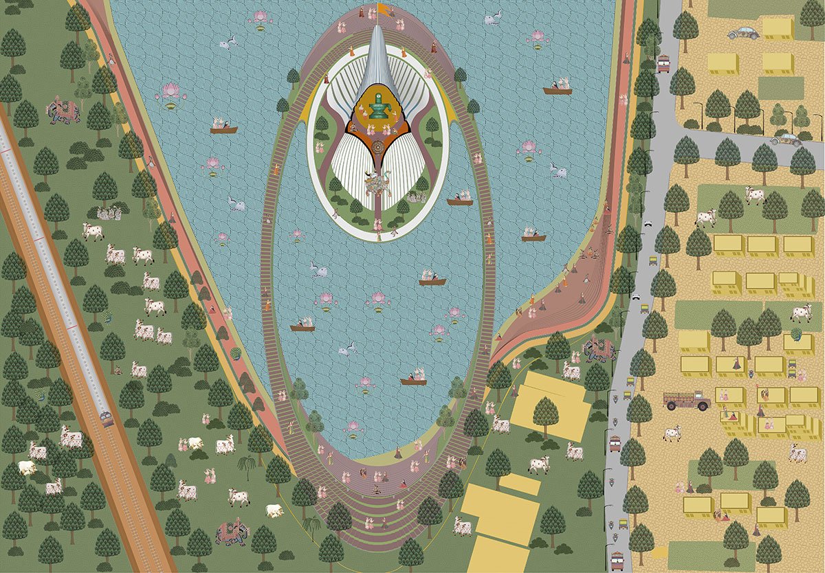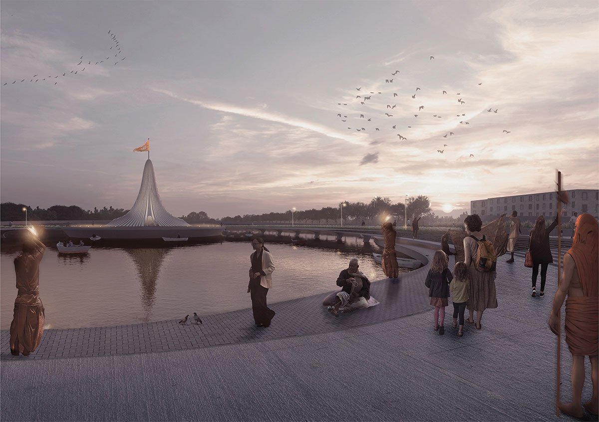 [Text as submitted by architect] Located in the semi-urban settlements of Amalsad, Gujarat, The Andheshwar Shiva Temple Trust proposes a new temple structure bridging the existing complex, demanding an architectural statement for the setting, where an existing lake becomes the site for the proposed structure.