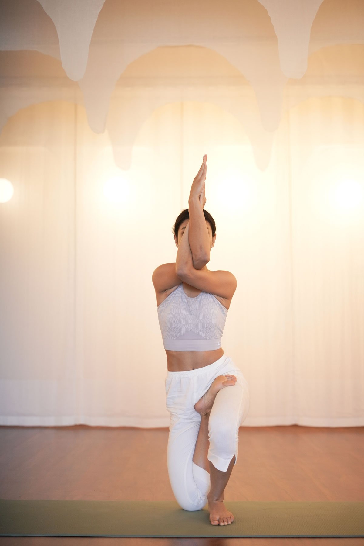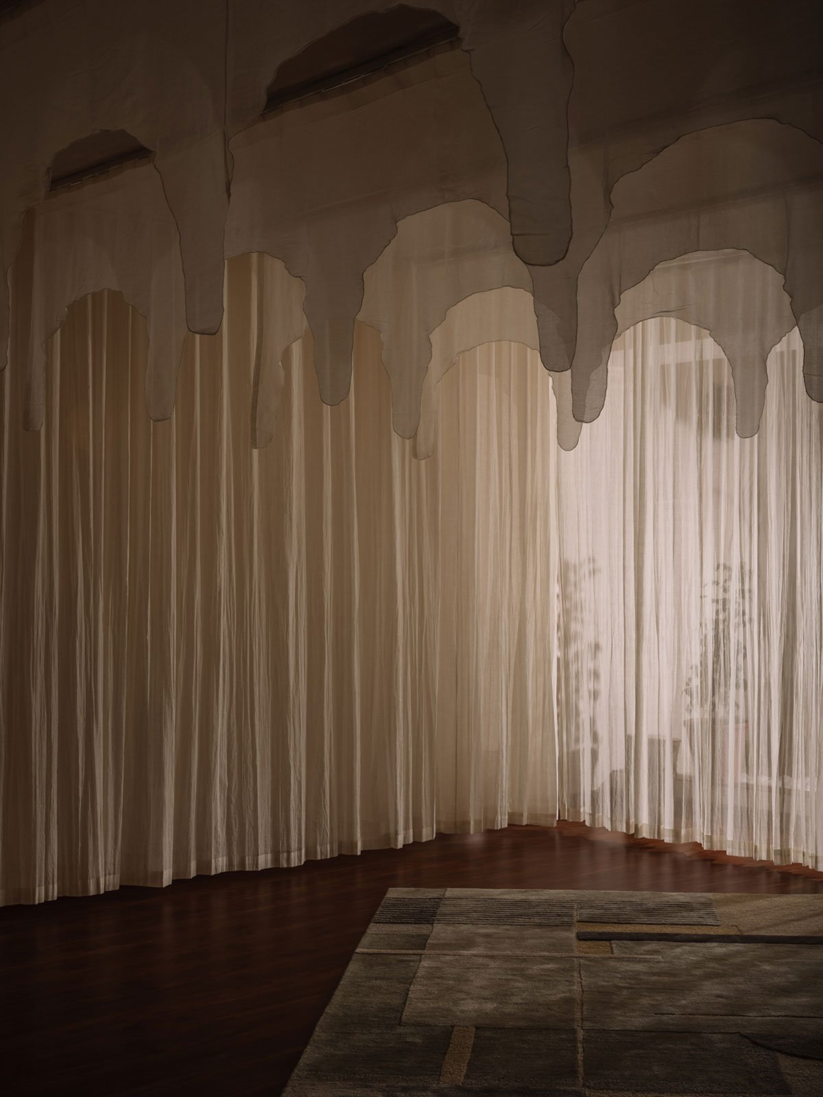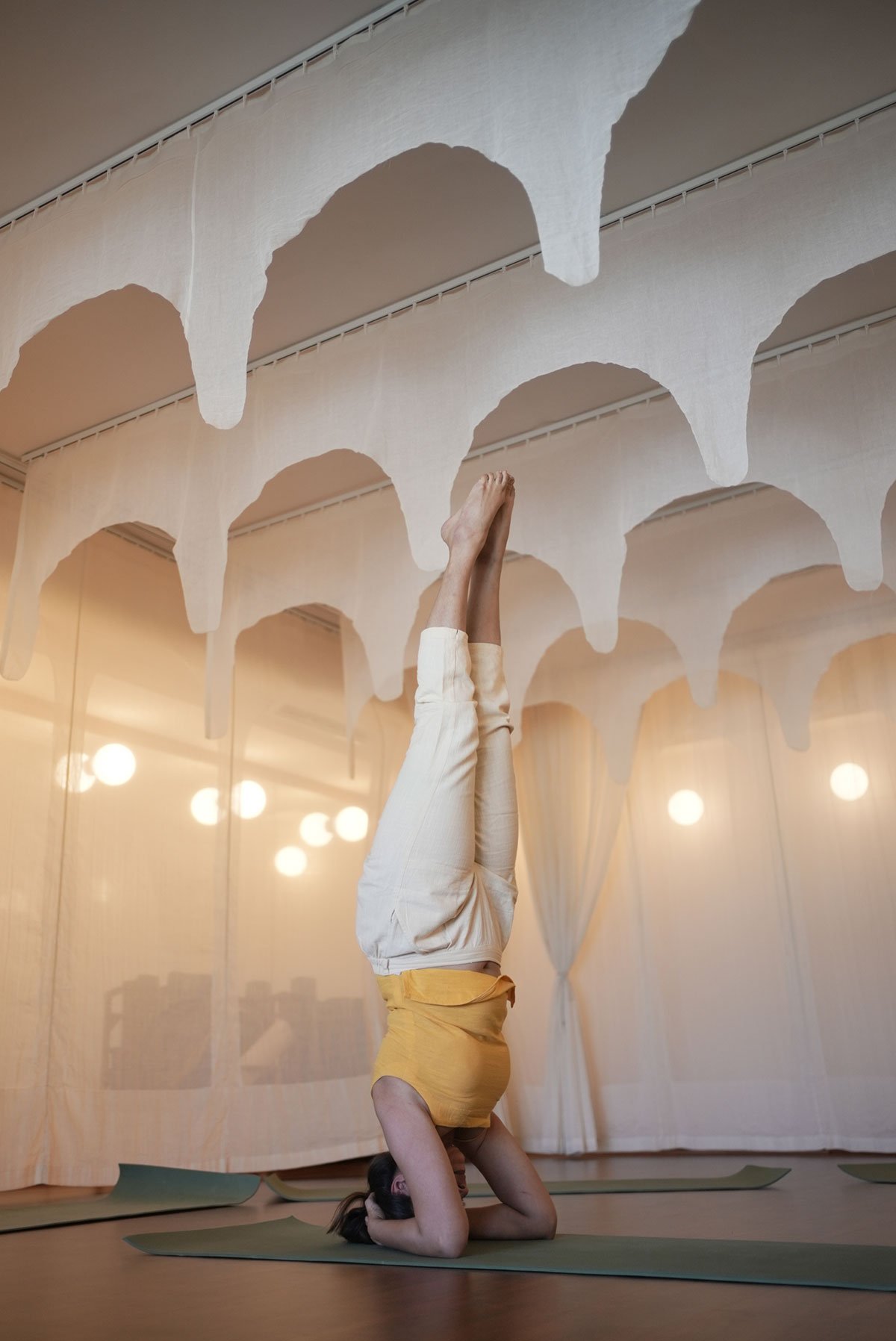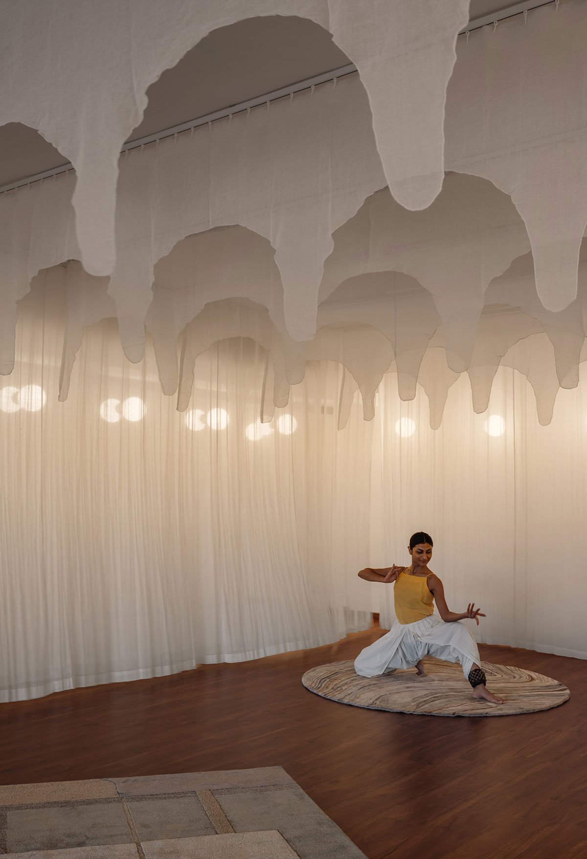 Upon entering the studio, the visitor’s gaze will naturally be drawn to the layers of curtains. Carefully selected and strategically positioned, these curtains create a visual flow that mirrors the graceful movements of both Bharatnatyam dance and yoga. They subtly guide one’s sight, infusing the space with a soothing rhythm while also providing a sense of seclusion, allowing to fully immerse themself in their practice without distractions. During performances, a curved layer of curtains adds a touch of drama and intrigue, capturing the mesmerising interplay of light and shadow, further enhancing the studio’s ambience.