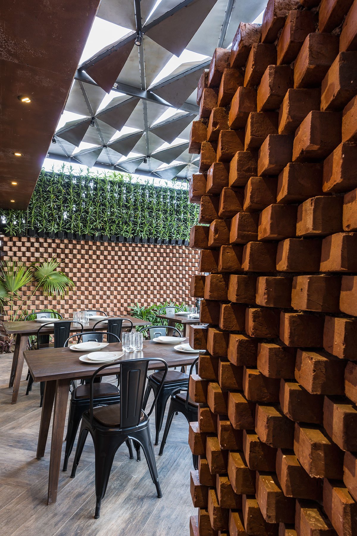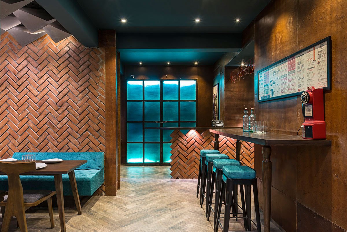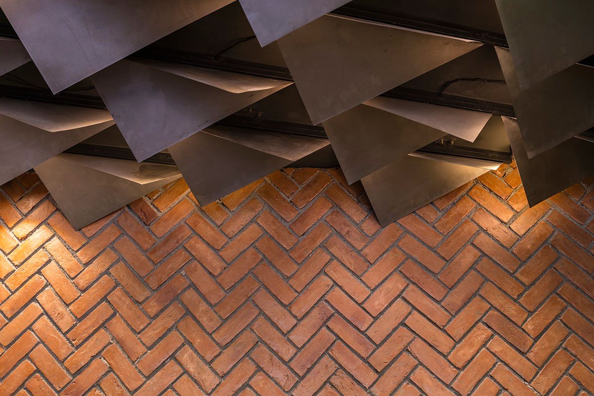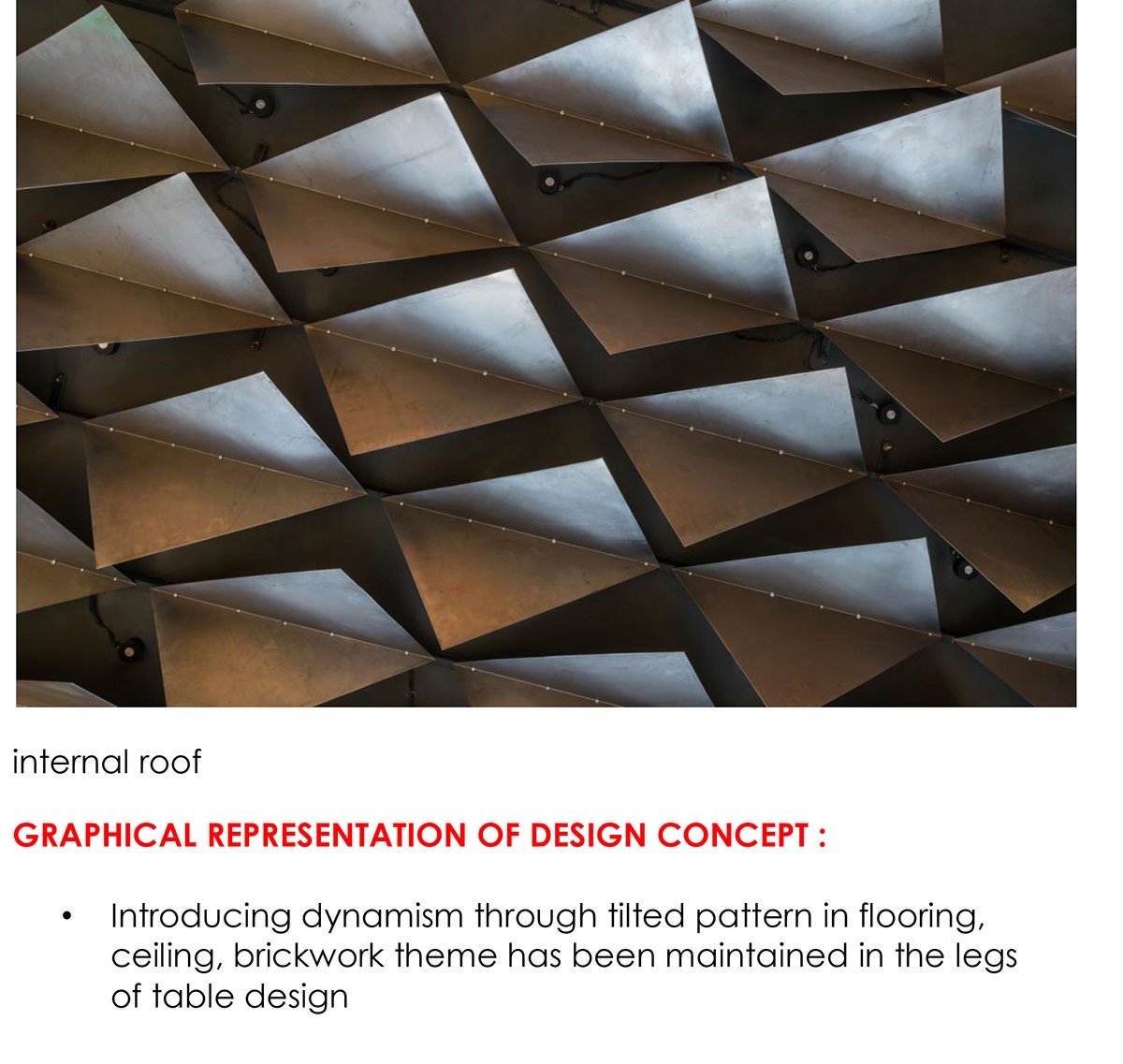 A diagonal grid concept was used to erase monotony and create a dynamic effect. The diagonal design added new forms to flooring, ceiling, and brickwork maintained even in the creation of table legs. The brickwork with dynamic twist led to tilted bonds in elevation and even planned. This gifted the space with varied textures in the same material.