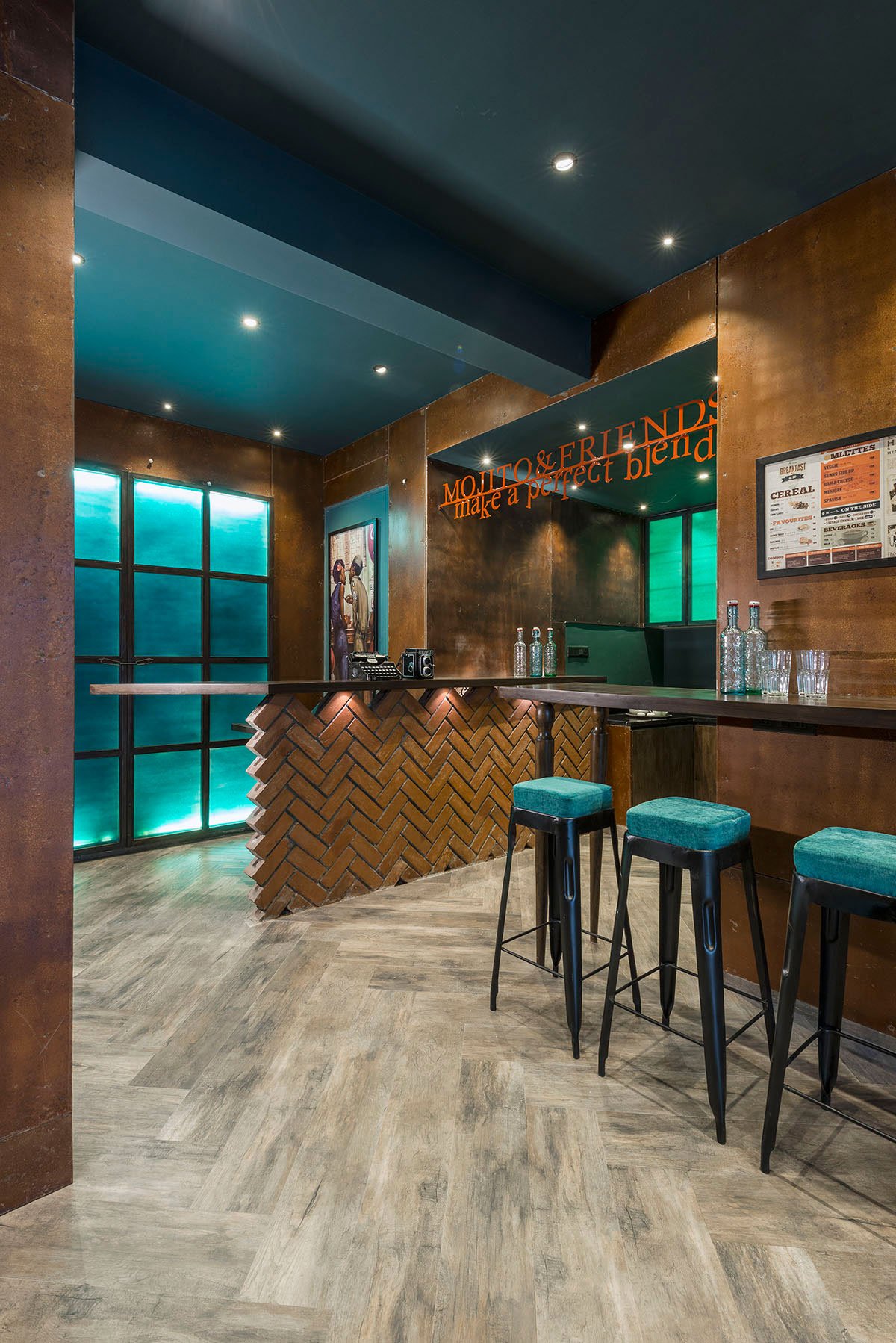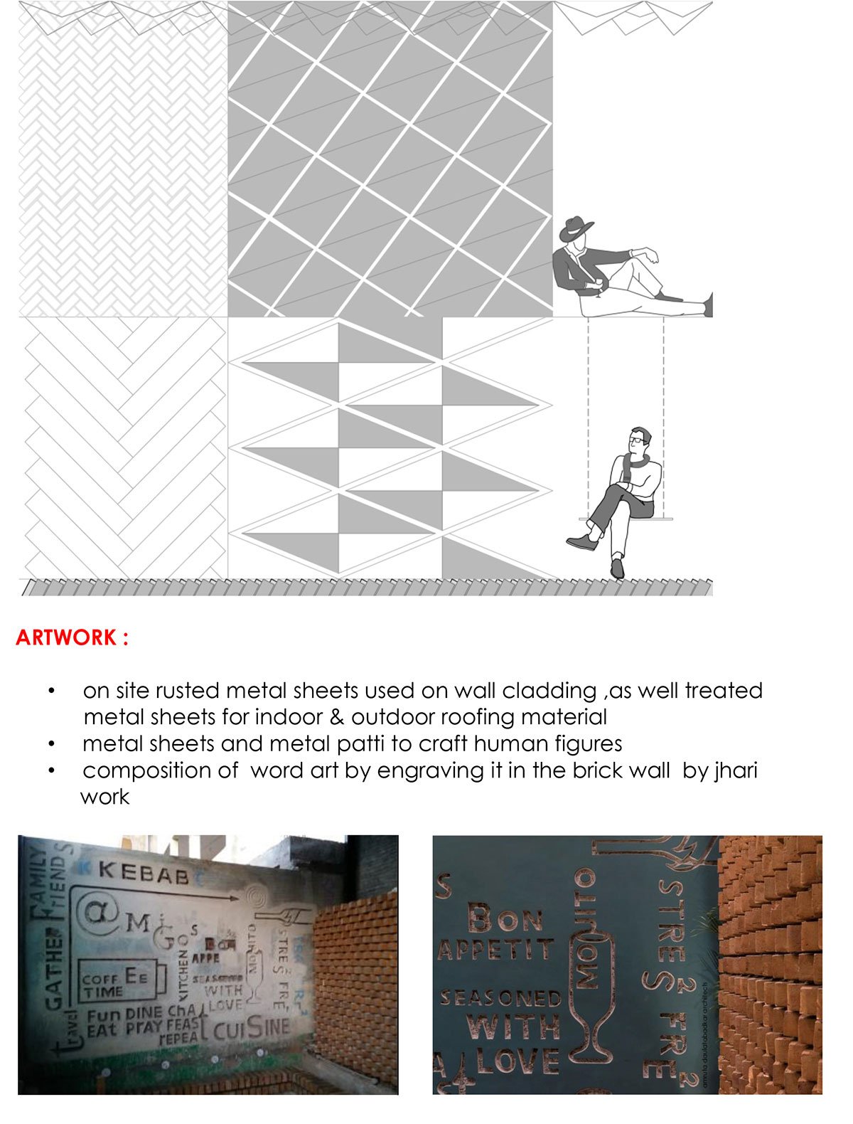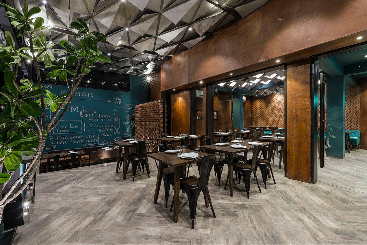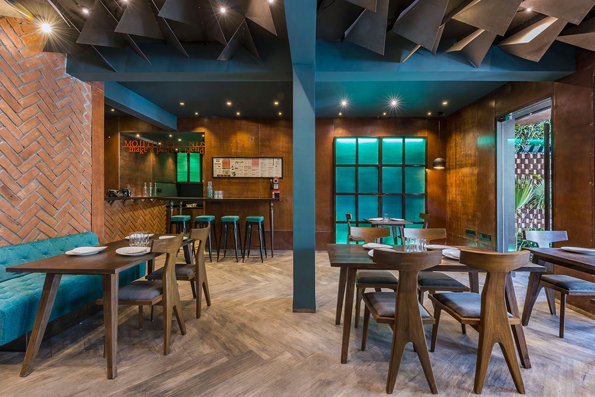 A diagonal grid concept was used to erase monotony and create a dynamic effect. The diagonal design added new forms to flooring, ceiling, and brickwork maintained even in the creation of table legs. The brickwork with dynamic twist led to tilted bonds in elevation and even planned. This gifted the space with varied textures in the same material.