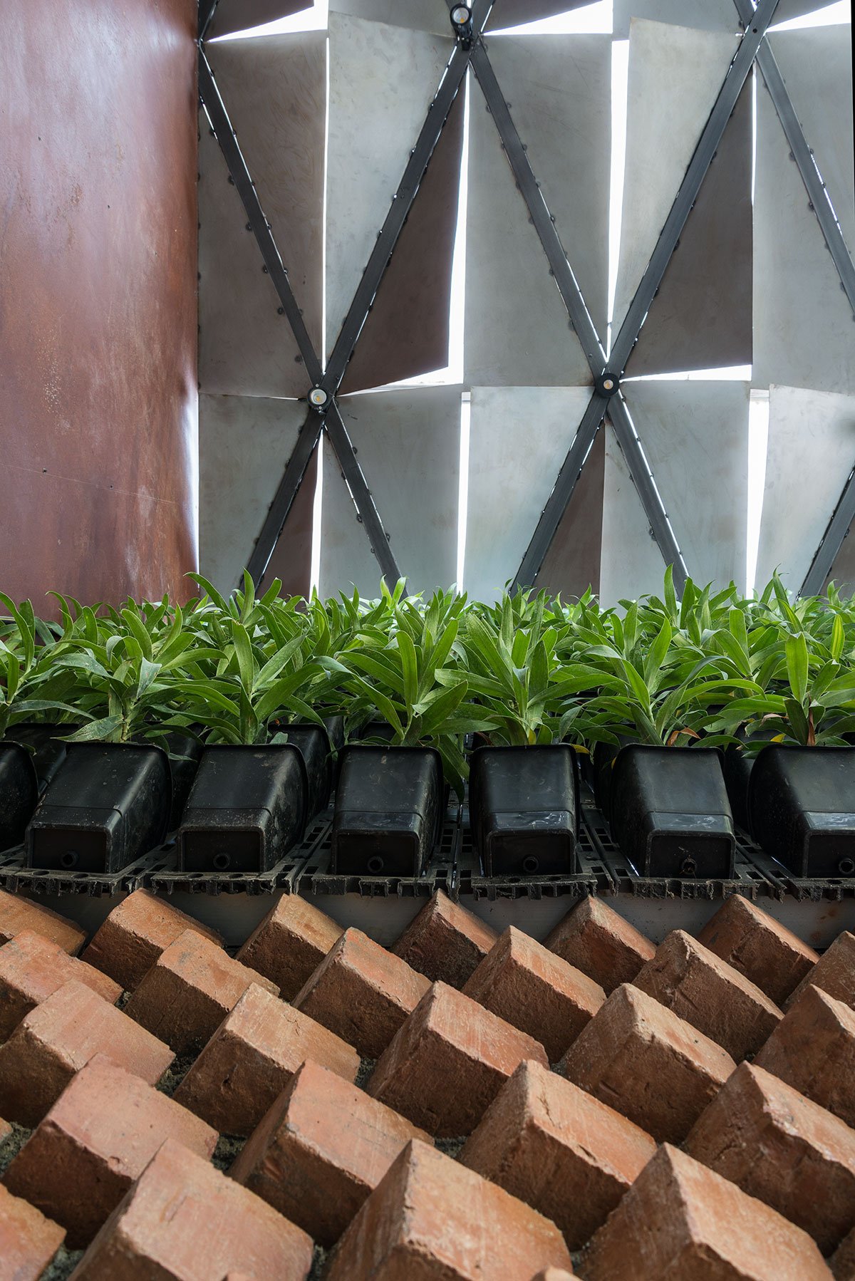 The limited material selection then consciously veers towards an experimental approach with metal panels, wire cut bricks, vitrified flooring, and tinted bajara glass, a combination of rustic and vibrant colours – to prevent alienating from the theme. The wire-cut mud bricks and rustic metal panels form a monochromatic palette.