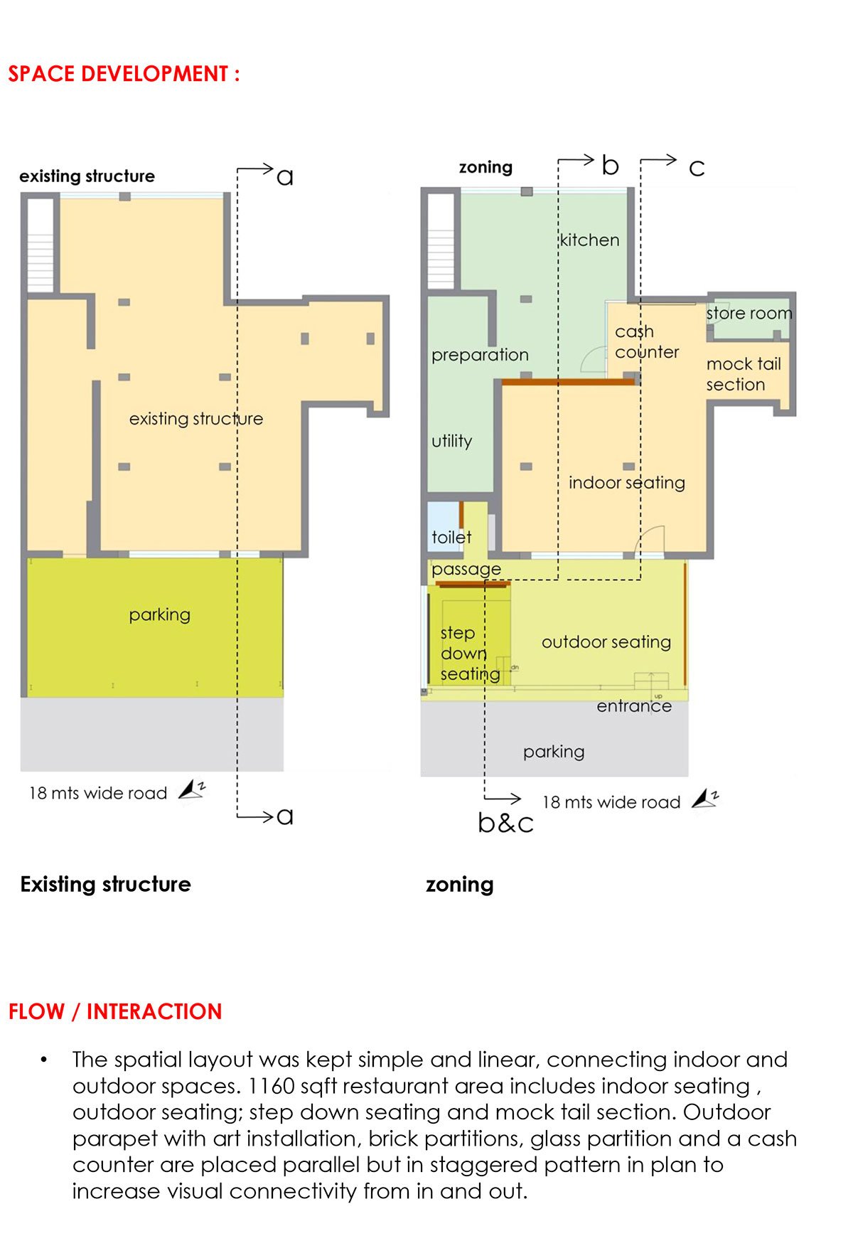 [Text as submitted by Architect] Located in a context with residential as well as institutional buildings flanked by a busy road, the site was a small block where a contemporary restaurant was to be designed. The ambience had to serve the comfort of family’s while being relevant to the younger student crowd. The premises also had to be screened off the busy road to minimize disturbance while maintaining some connection to create an inviting composition.