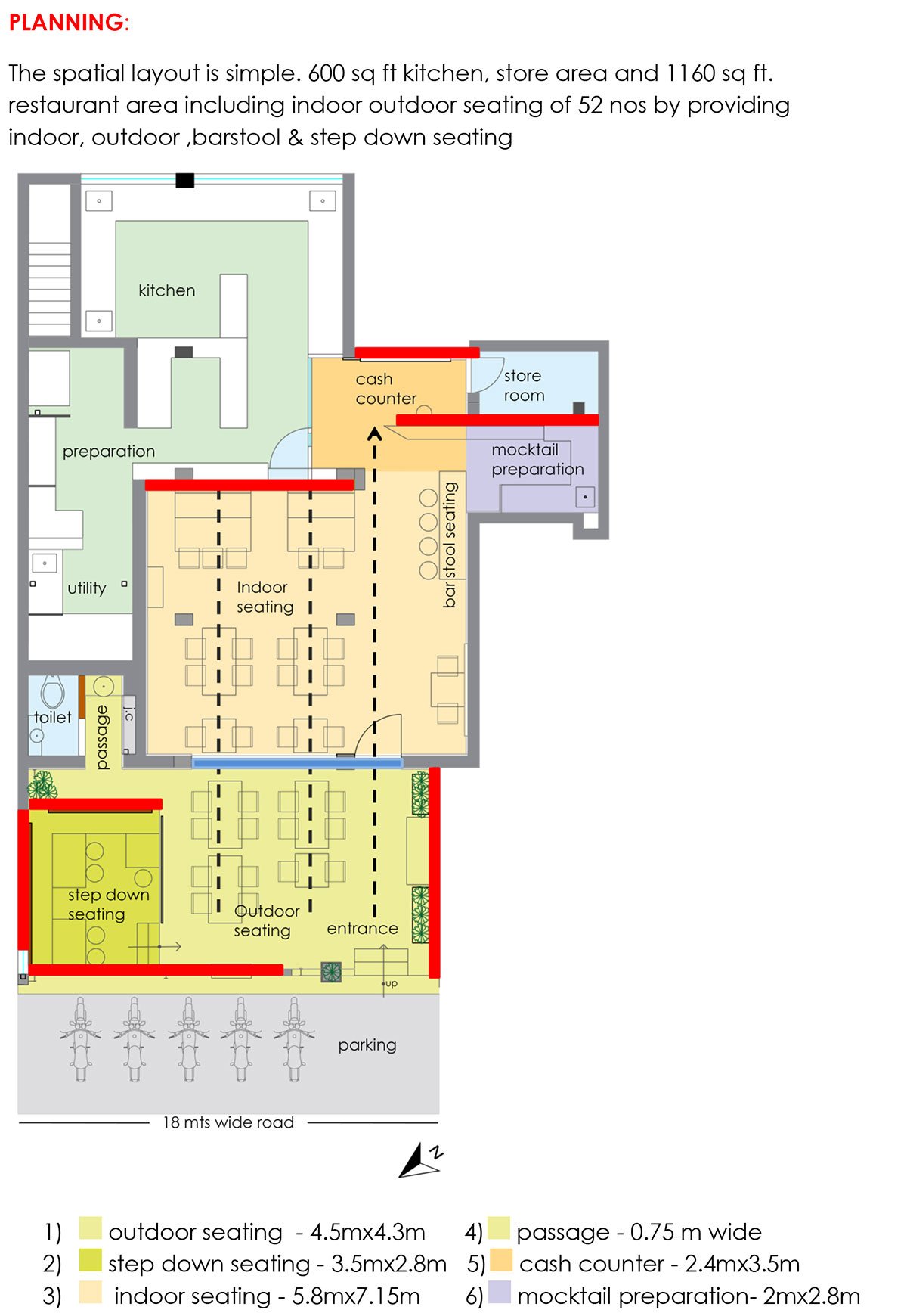 Restaurants are all about fetching new dining experiences. Though provided with a small site to cater to the variety of users and create a multitude of dining and interactive experiences, we set to design varied seating areas. Thus, the dining area was divided into indoor and semi-open outdoor seating. The outdoor seating had a step-down seating, while a mocktail counter was designed indoors. However, making the space feel vast and not compact was important. This was achieved with linear planning and play of levels.