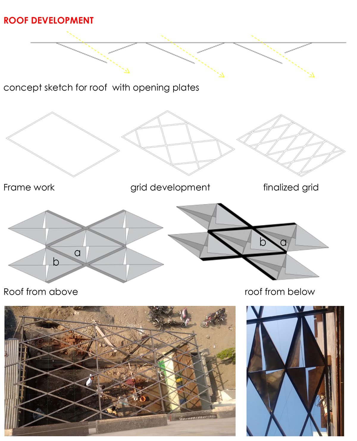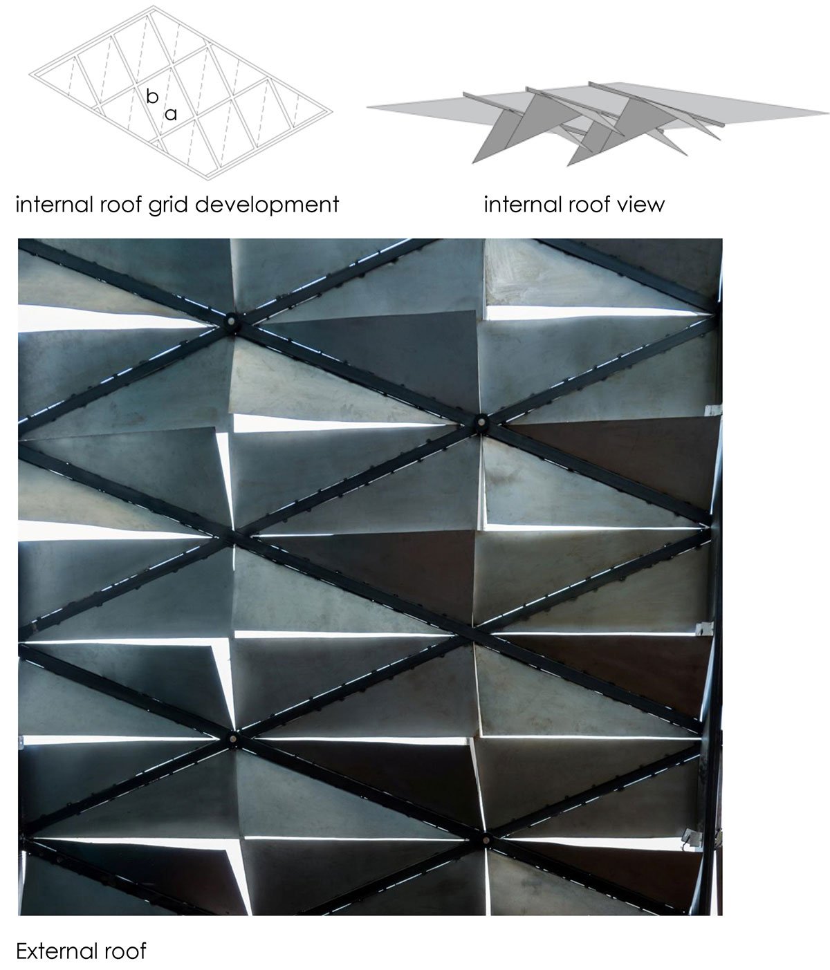 Tilted metal sheets were used in external and internal roofs, creating a sense of dynamism hovering over the space. The same metal sheets are continued for wall panelling and to create sculptures adorning the façade.