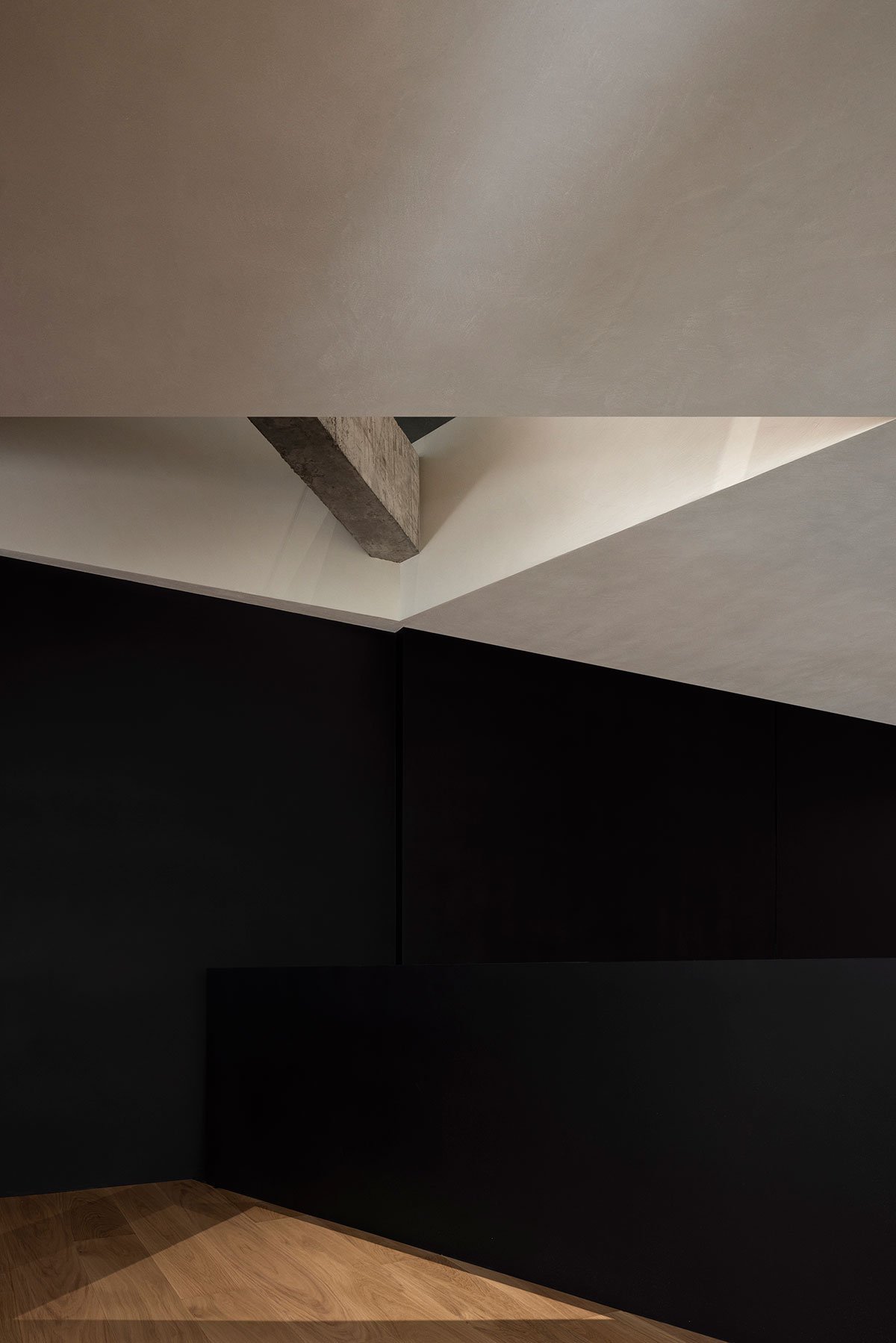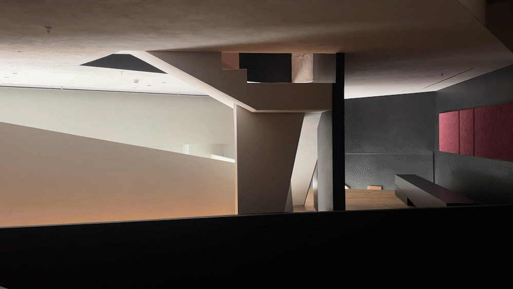 During construction, the concrete structural beams were naturally exposed, resulting in an unintentional yet striking design feature. The triangular relationships within the space naturally form diagonals and slanted surfaces, completing the spatial composition through the flow of people.