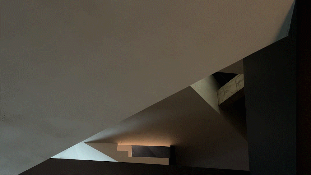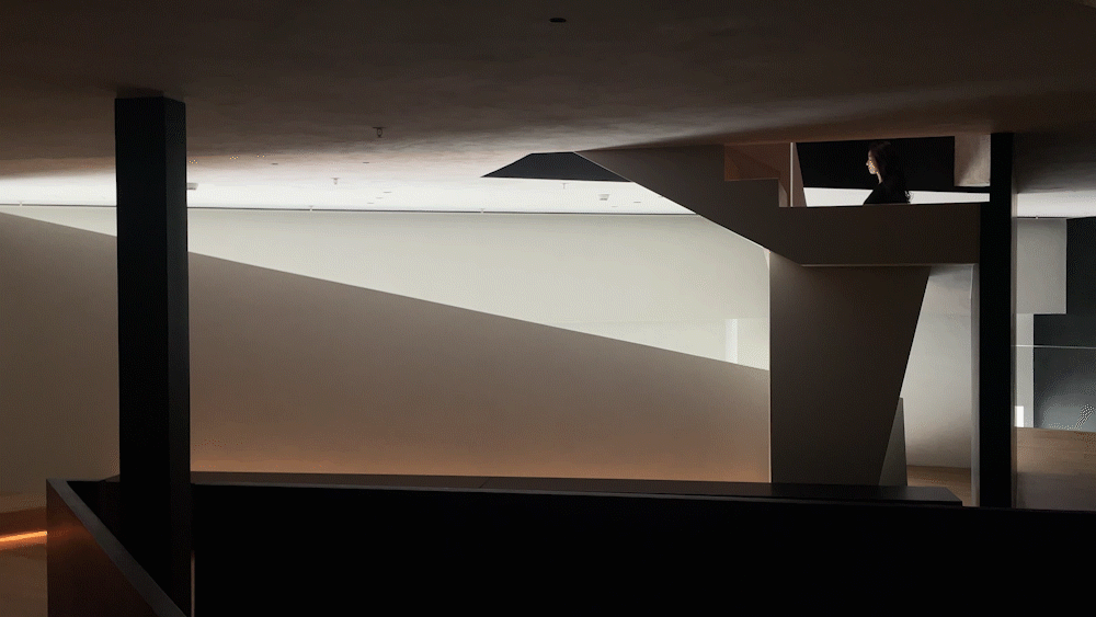 Throughout this visiting circulation, an exploratory experience is created. The inverted triangular opening of the mezzanine cleverly introduces the view of outdoor trees into the space, offering a unique visual experience. On the first floor, the visual experience highlights spatial infinity, while the mezzanine provides a perspective that connects the first and second floors, showcasing their contrasting yet integrated relationship. The staircase to the second floor, although linking the mezzanine and the second floor, visually centers on the first floor, providing an unexpected visual delight.