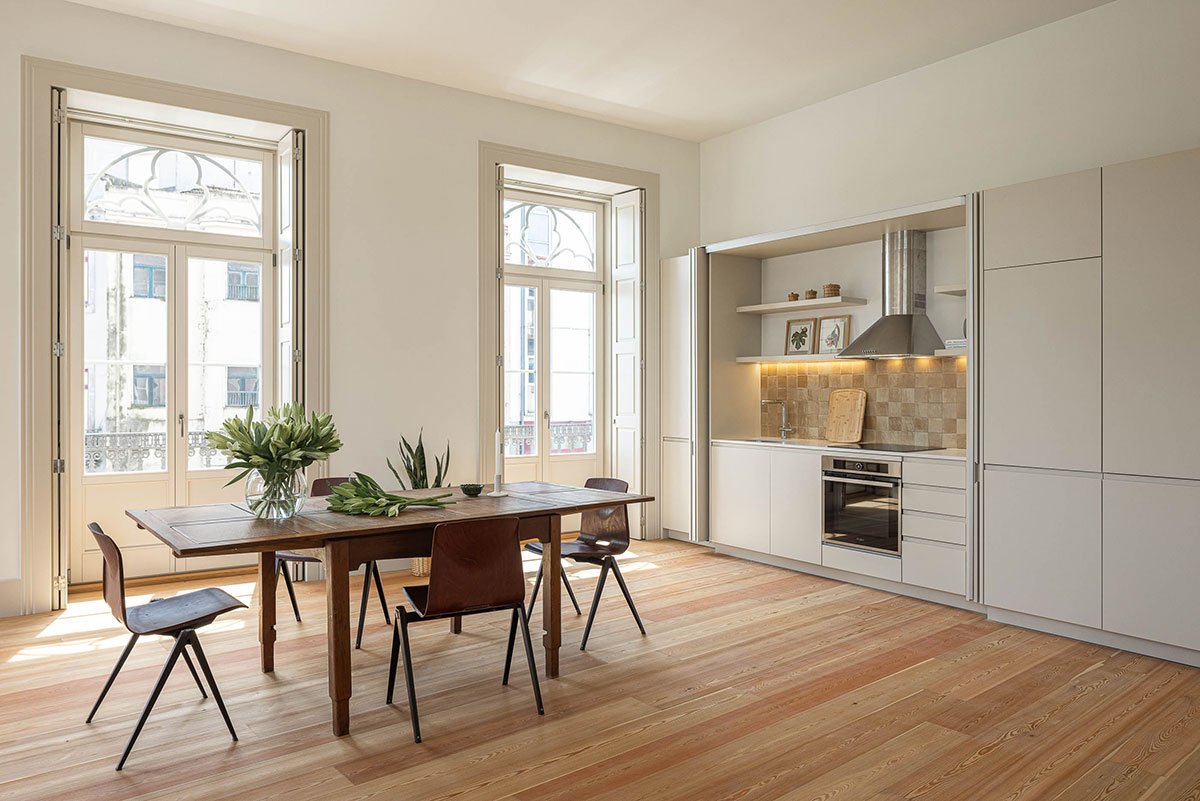 Excerpt: Antigo Hotel do Louvre, an interior design project by Diana Barros Arquitectura, transforms the historic building into a collective housing with commercial and residential spaces. The project respects the building’s polyvalence, maintaining its organization, decorative work, and structural system. The refurbishment preserves the building’s unique features, such as the facade stonework, interior and exterior carpentry, and the central staircase.