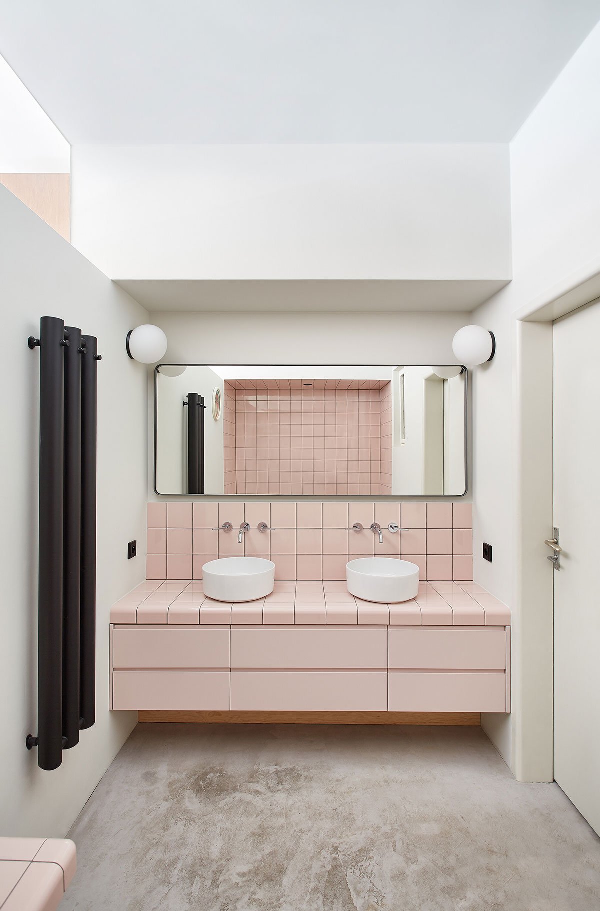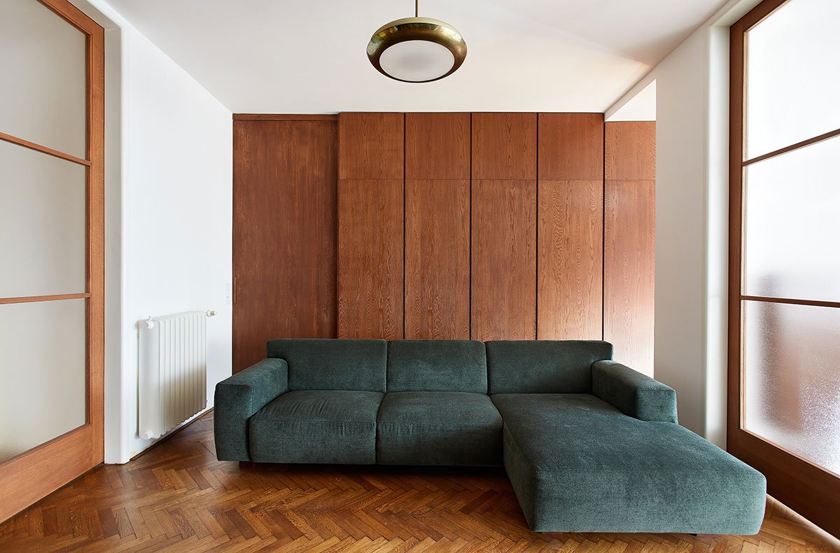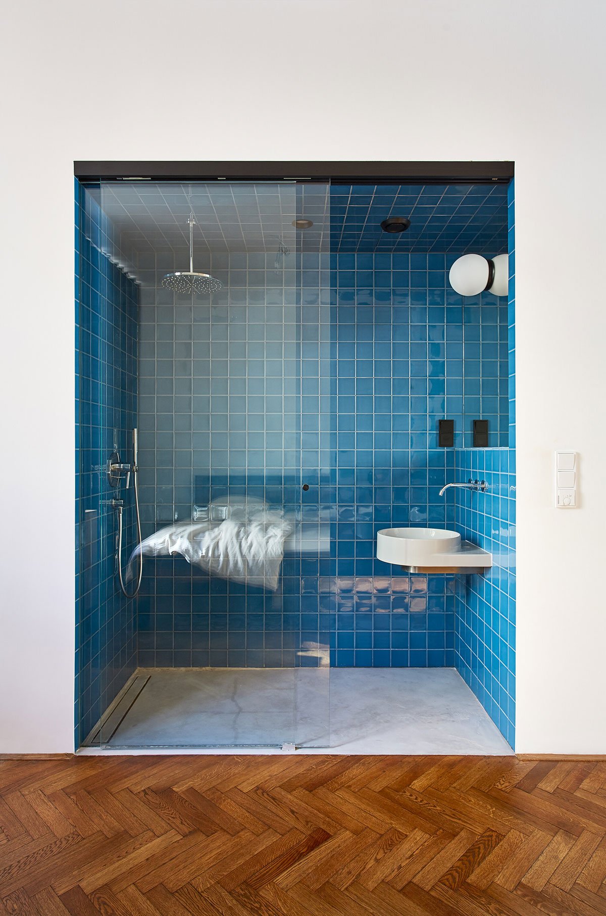 Upon entering the apartment in the vestibule, there is a built-in wardrobe with oak veneer panelling, which matches the colour and finish of the frames of the original folding doors, which were refurbished. The oak veneer goes around the corner as wall panelling, which hides the sliding door. The same veneer enters the main living space in the form of the high parts of the kitchen. Above these is then the skylight from the main bathroom. The entrance to the bathroom is through a wardrobe near the vestibule of the apartment. The bathroom and its layout remain in the same place as in the original layout of the apartment. The client’s wish was for a seamless floor in both the bathrooms and the separate toilet. For feasibility reasons, a concrete screed was chosen which complemented the type and method of bathroom tiling well.