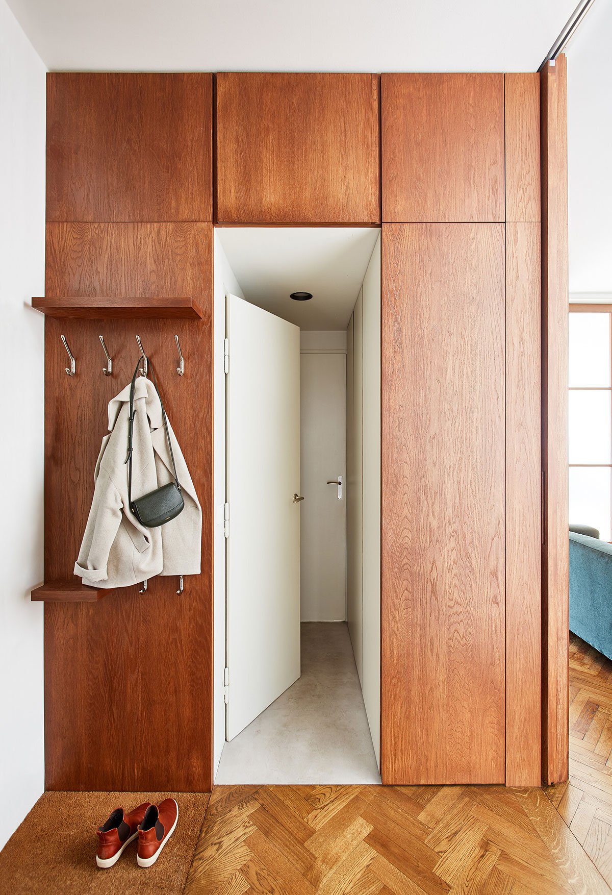 The central space of the apartment is the hall with a bookcase made of black oak veneer. The hall is connected to the main living room and bedroom by the original folding glass doors. The bedroom has its own small bathroom niche which is lined with blue tiles. From the vestibule the bedroom can be accessed through a walk-through wardrobe. The bedroom is visually separated from the hall by a root veneer wardrobe. The other room and the workroom are accessed from the walk-through wardrobe, which is in beige and pink.