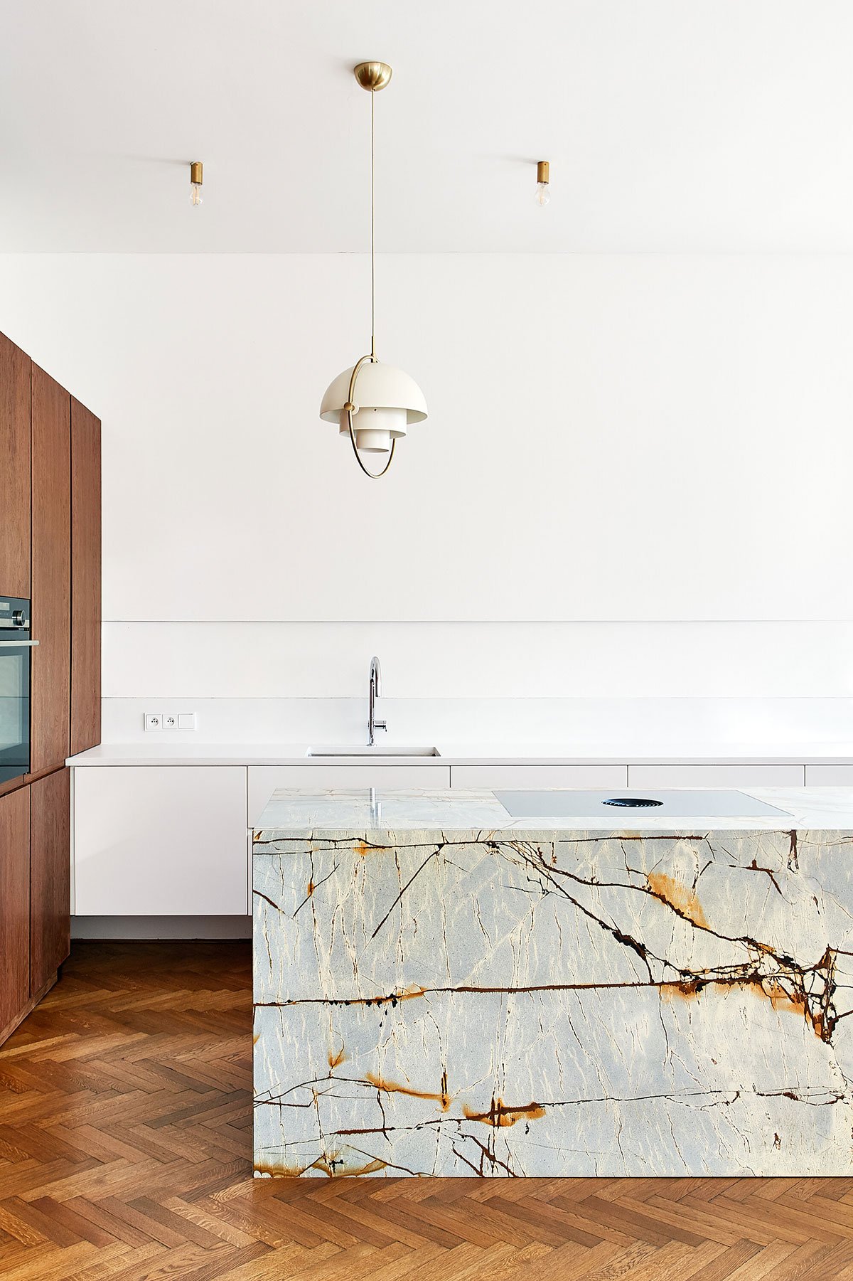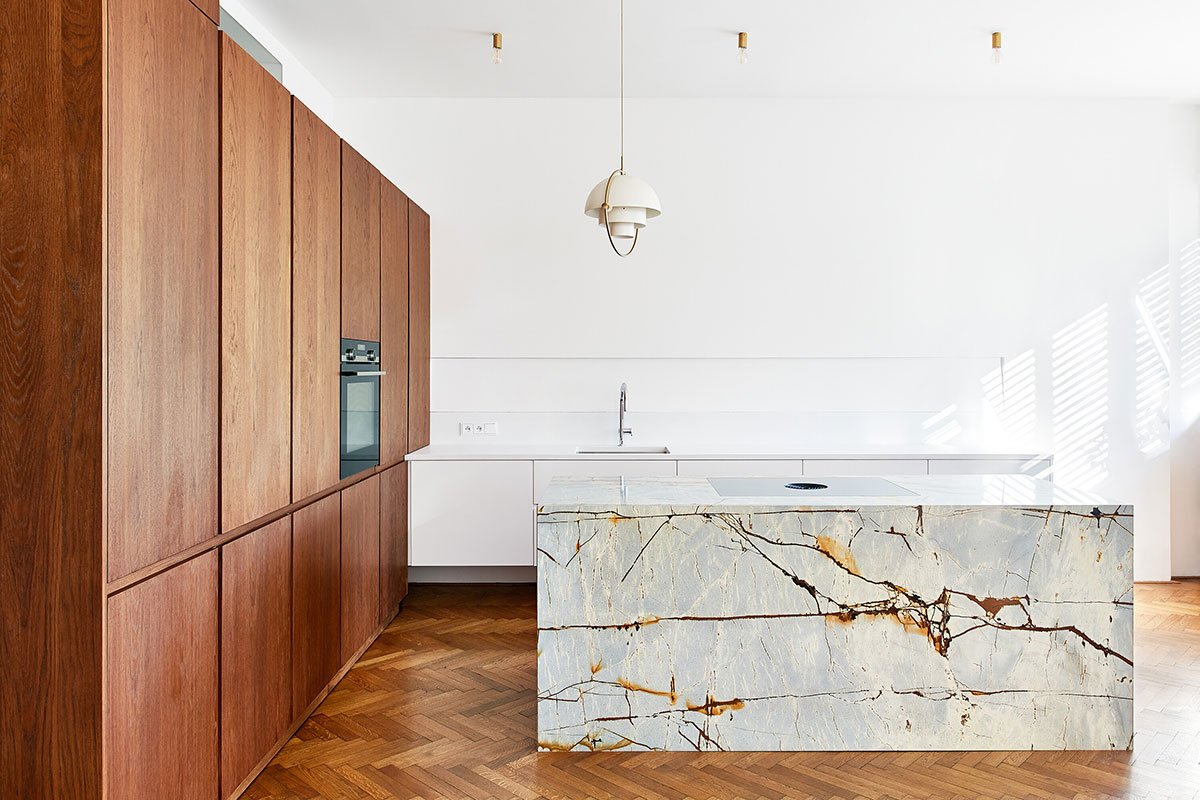 The jewel and probably the most expensive piece of the whole apartment is the kitchen island made of “space” quartzite. The island faces the living area of the apartment, which is situated in the alleyway. The back of the work counter is neutral in colour. The lighting of the kitchen countertop is hidden in a subtle notch above the plinth of the working concrete slab. The lighting of the island is offset from its mass. The Multi Lite Small light from Gubi, which was designed back in 1972, has become an icon that has suitably complemented the spirit of the whole apartment.