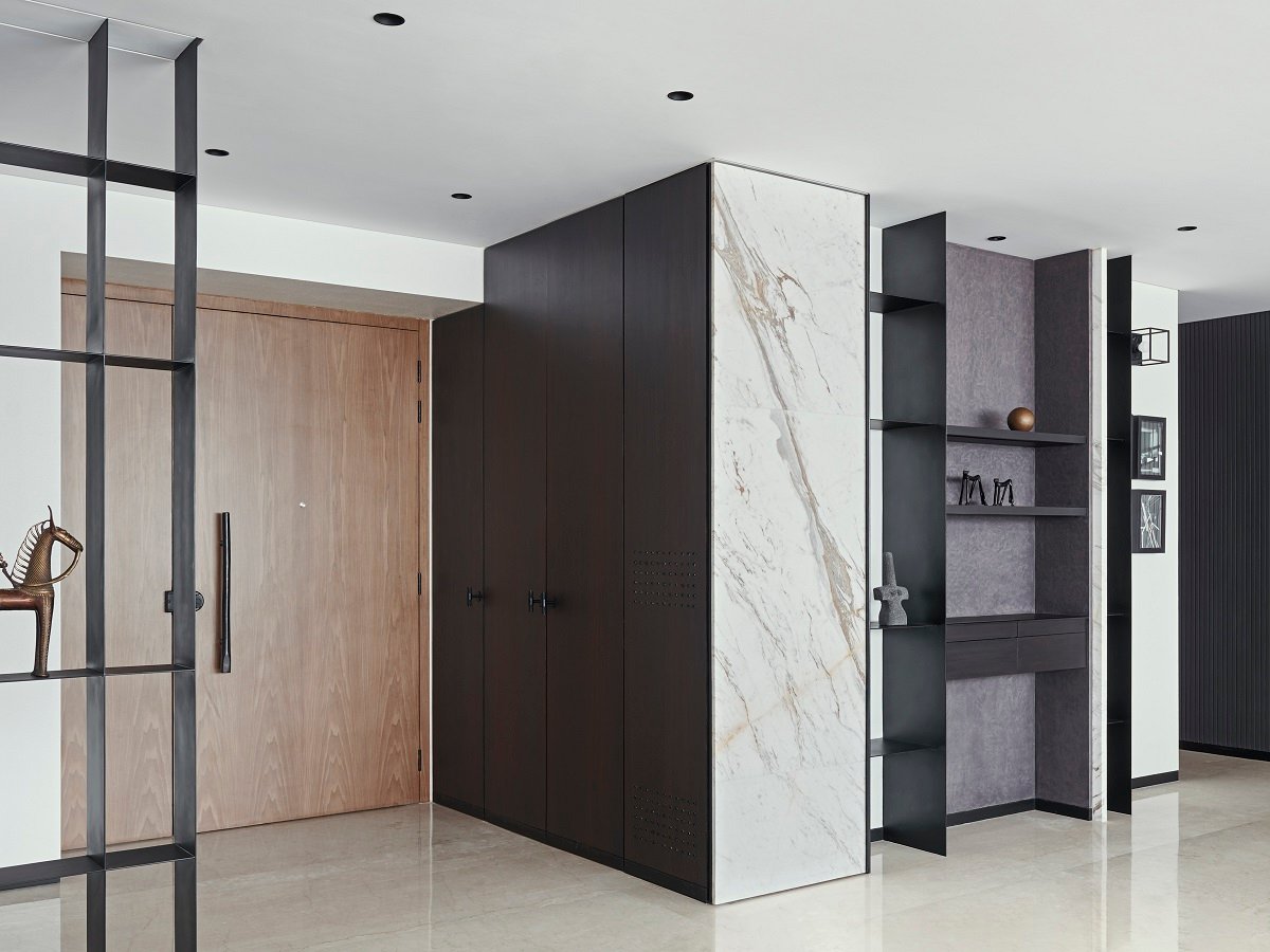 Excerpt: Apartment 2501 is a residence designed by Shroffleon. The brief provided was to design a minimal, sleek, and modern house, where every corner is rich in design and aesthetic values, but at the same time minimal and elegant. Use of exclusive materials like statuario marble and variation of three veneers is used throughout with chevron-patterned wooden flooring.