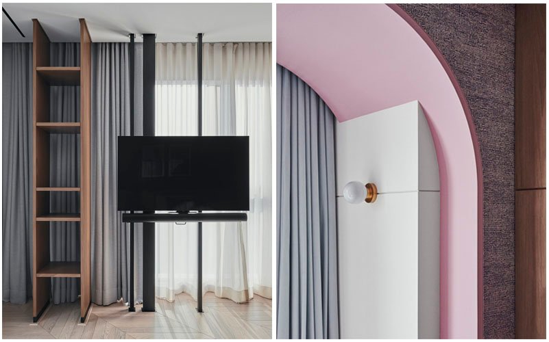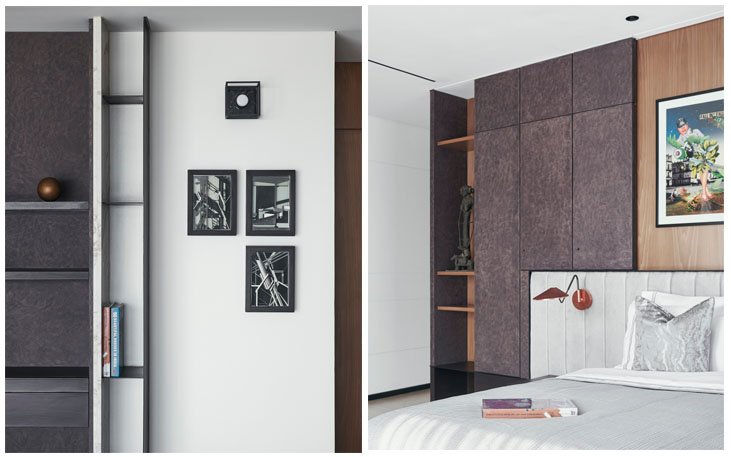 The construction was celebrated through intricate joinery details and juxtaposing two contrasting materials to make the design stand out. Use of exclusive materials like statuario marble and variation of three veneers is used throughout the apartment with a chevron-patterned wooden flooring to achieve a simple yet elegant look.