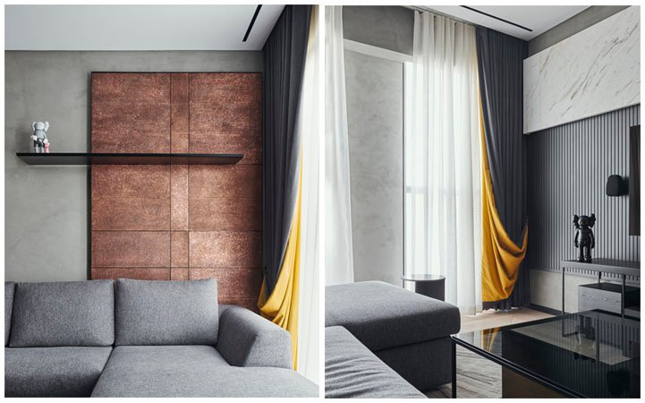 The entrance, flanked by the bar unit on one side is coated with a feature paint, highlighting it against the neutral grey backdrop of the living room. Our collaboration with Anand Prabhudesai helped us highlight the family room with copper panels against a monochrome palette.