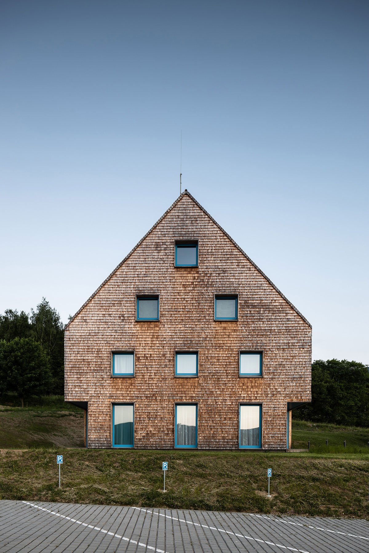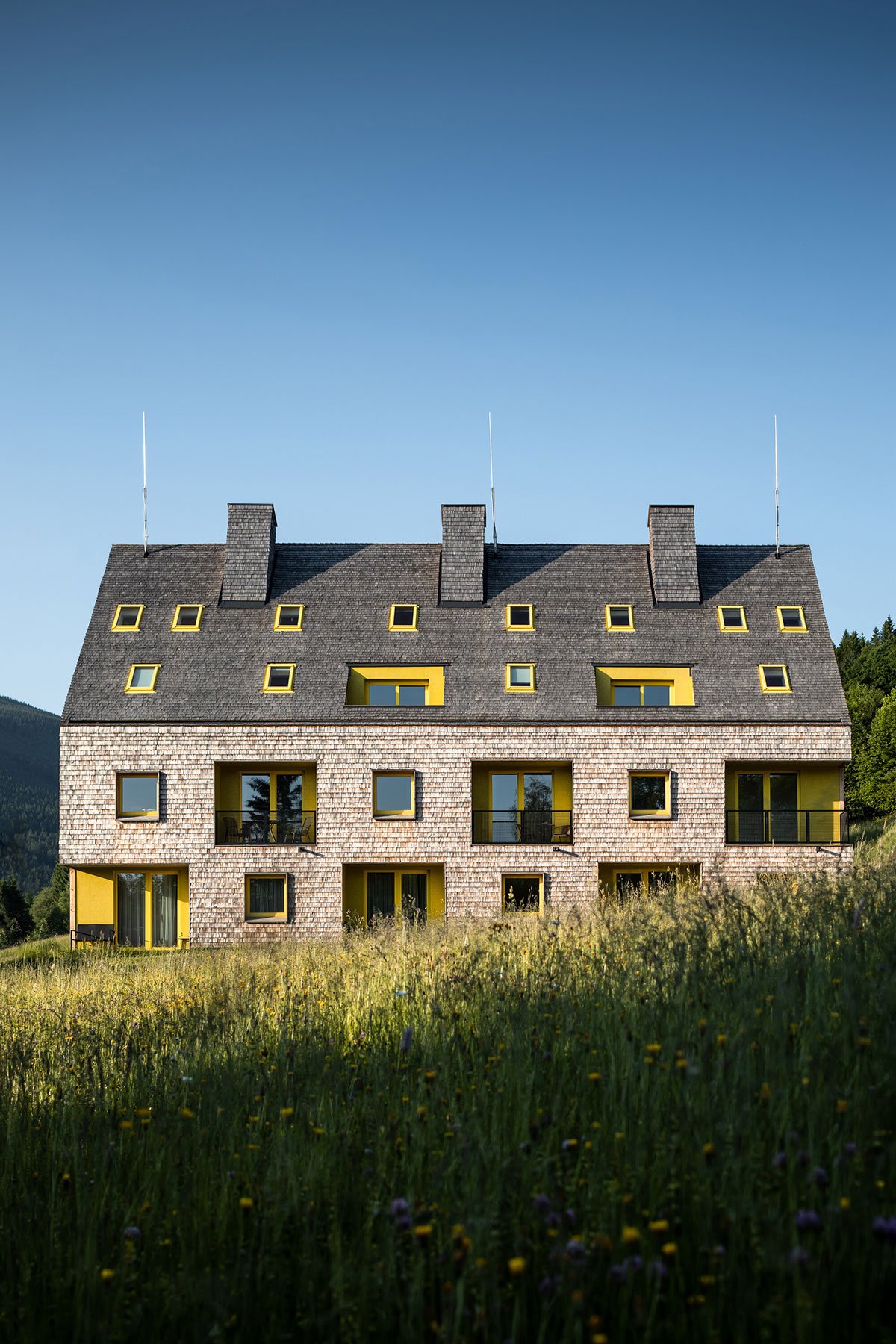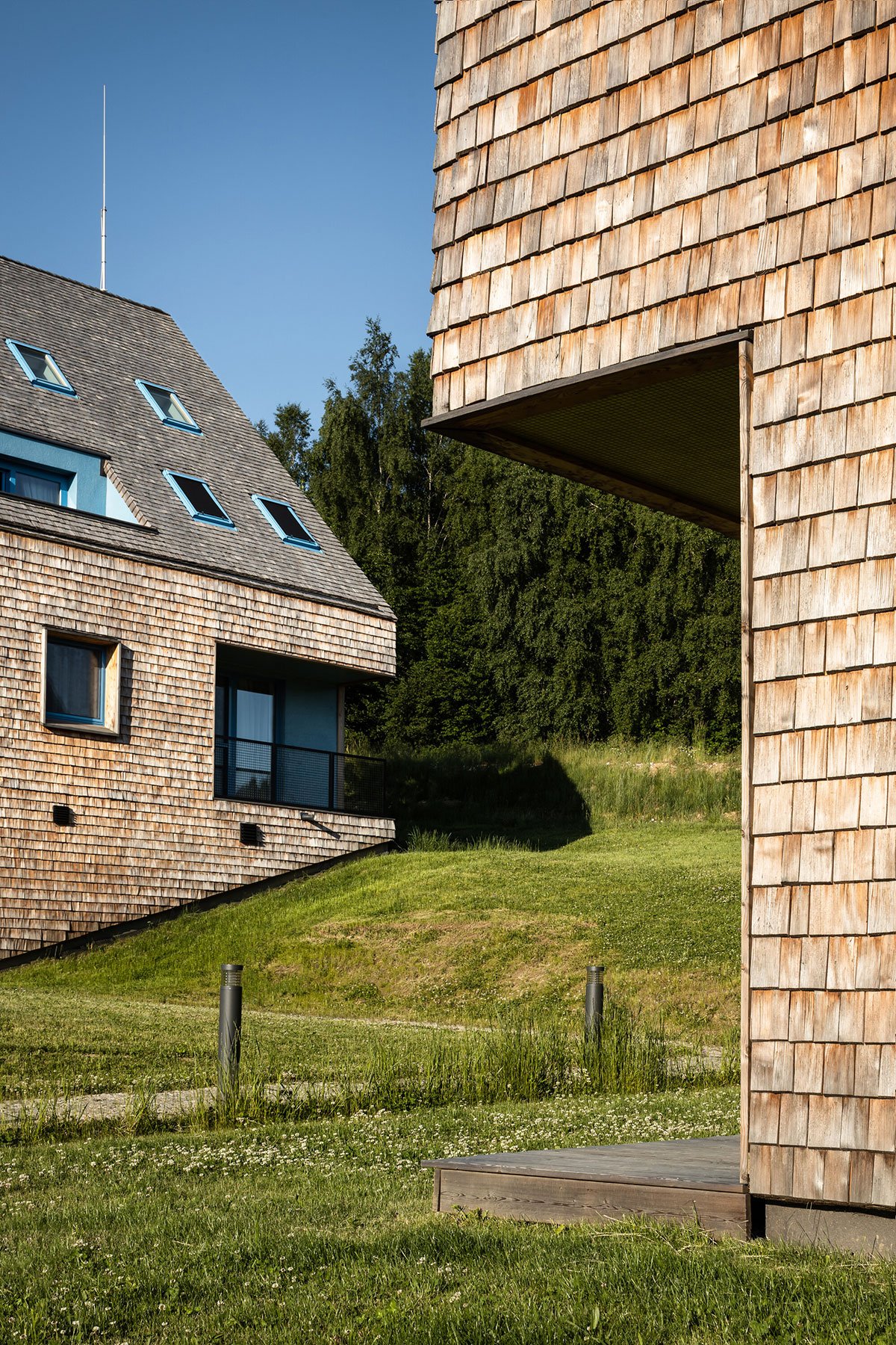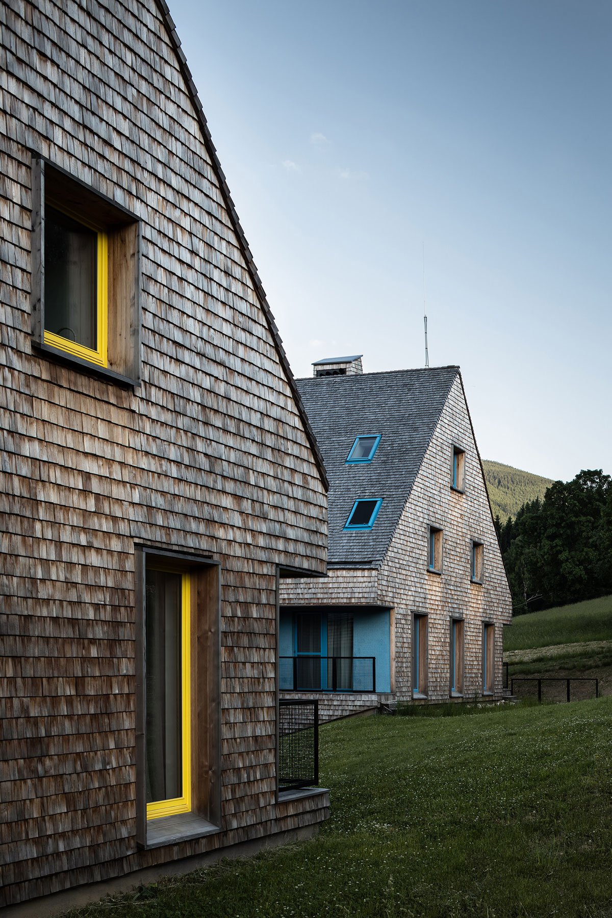 The design relies on traditional materials – the wooden cladding of larch shingles from the local forest, which is a free paraphrase of the facades of local barns, and gabels of residential buildings. Coloured loggias are set in contrast to the naturally greying cladding, adding a colourful accent and vibrancy to the buildings.