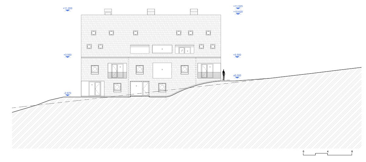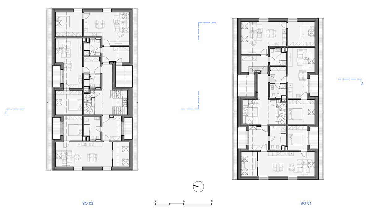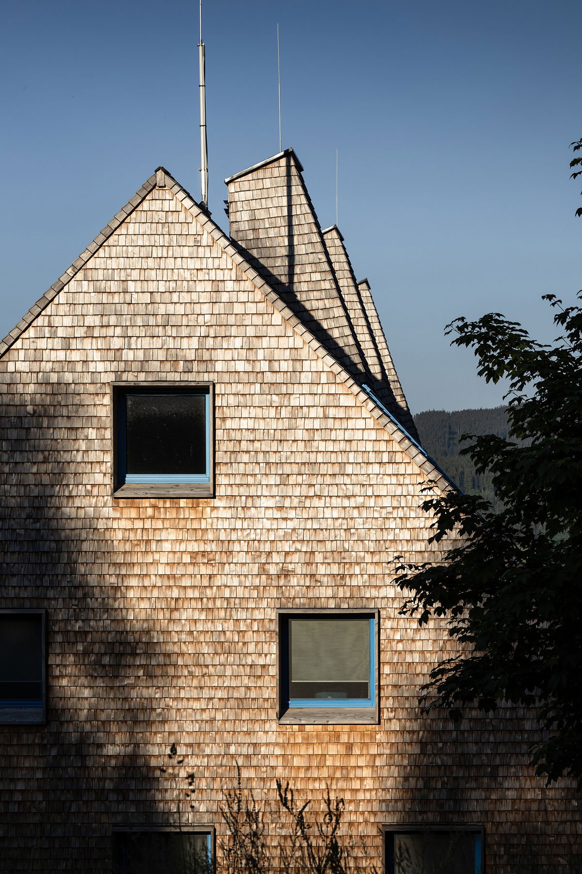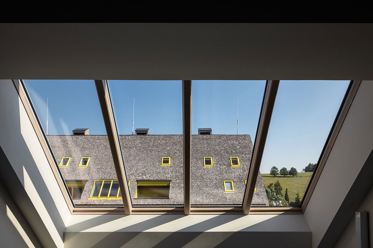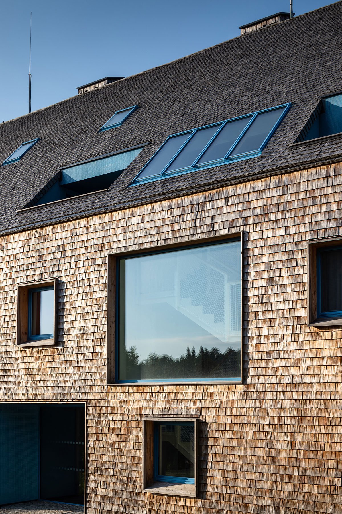 The design relies on traditional materials – the wooden cladding of larch shingles from the local forest, which is a free paraphrase of the facades of local barns, and gabels of residential buildings. Coloured loggias are set in contrast to the naturally greying cladding, adding a colourful accent and vibrancy to the buildings.