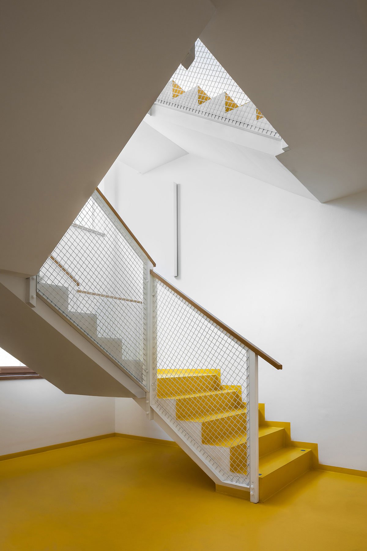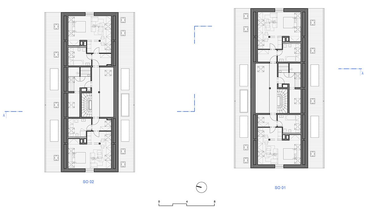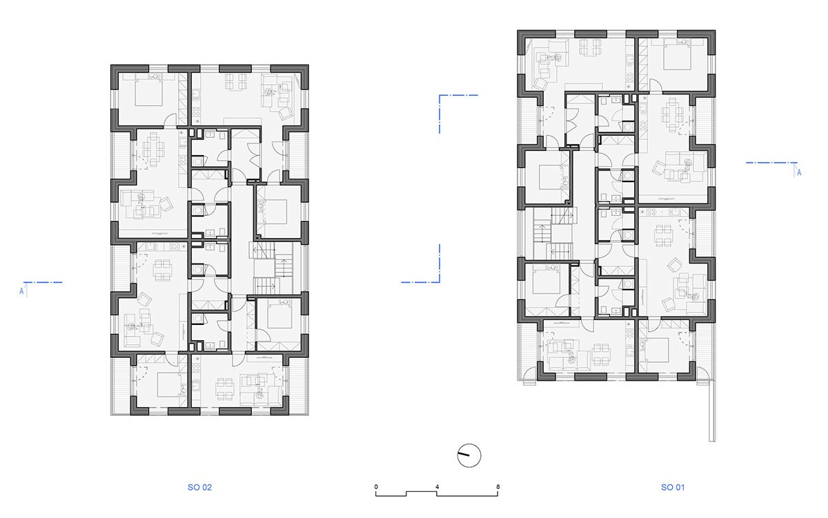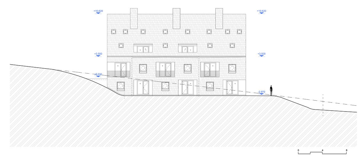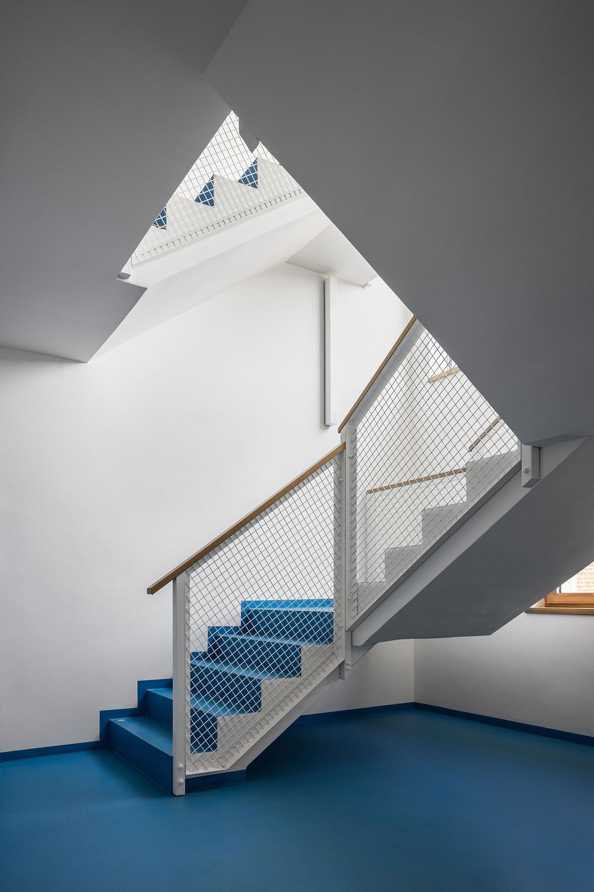 The design relies on traditional materials – the wooden cladding of larch shingles from the local forest, which is a free paraphrase of the facades of local barns, and gabels of residential buildings. Coloured loggias are set in contrast to the naturally greying cladding, adding a colourful accent and vibrancy to the buildings.