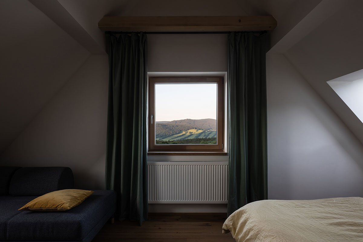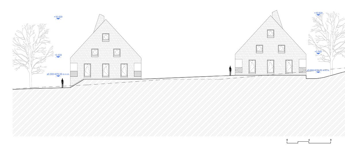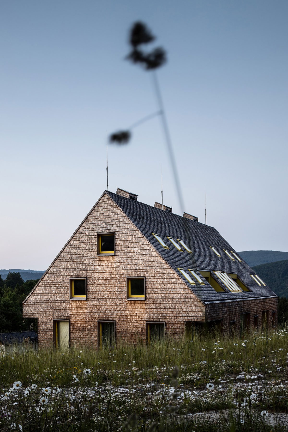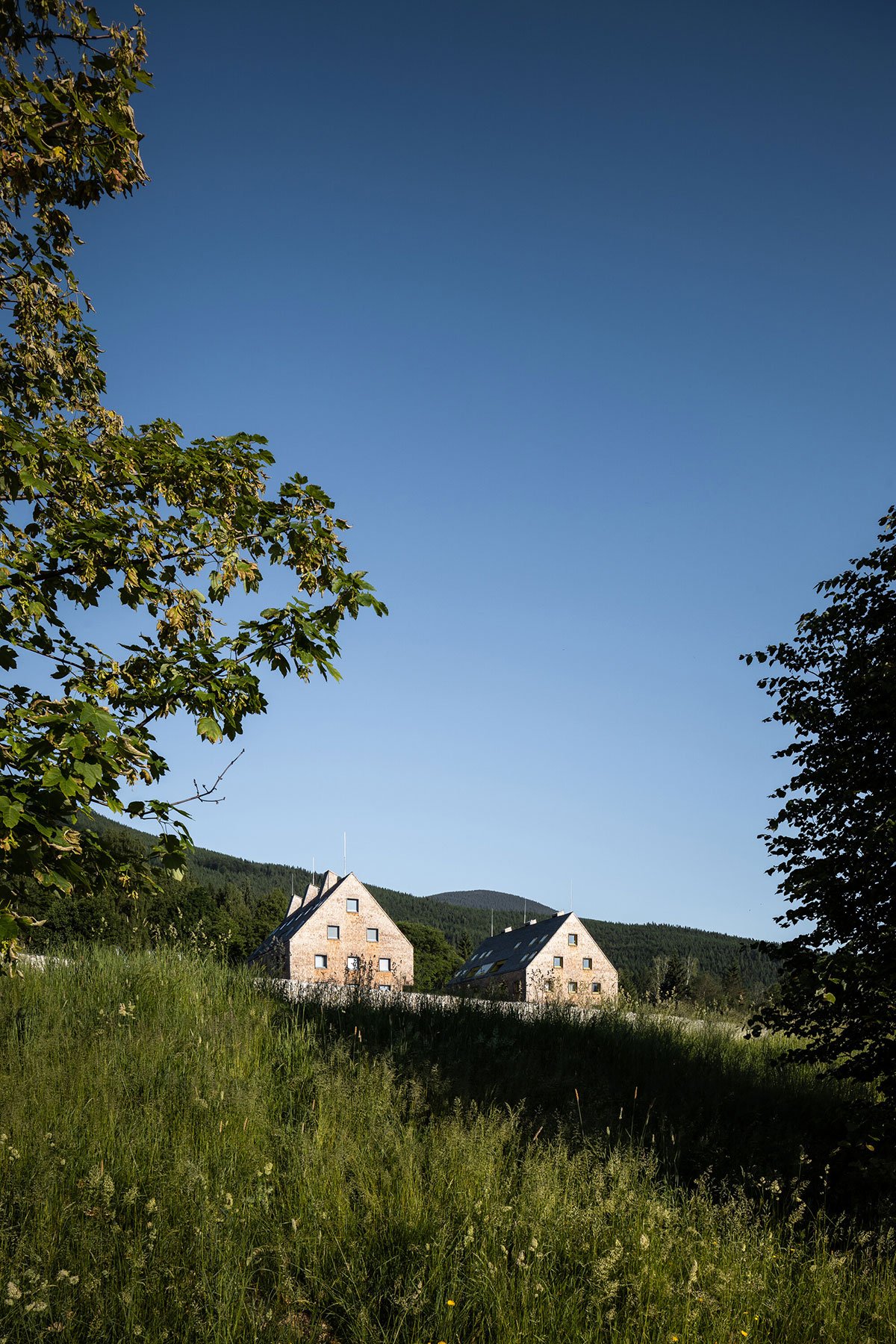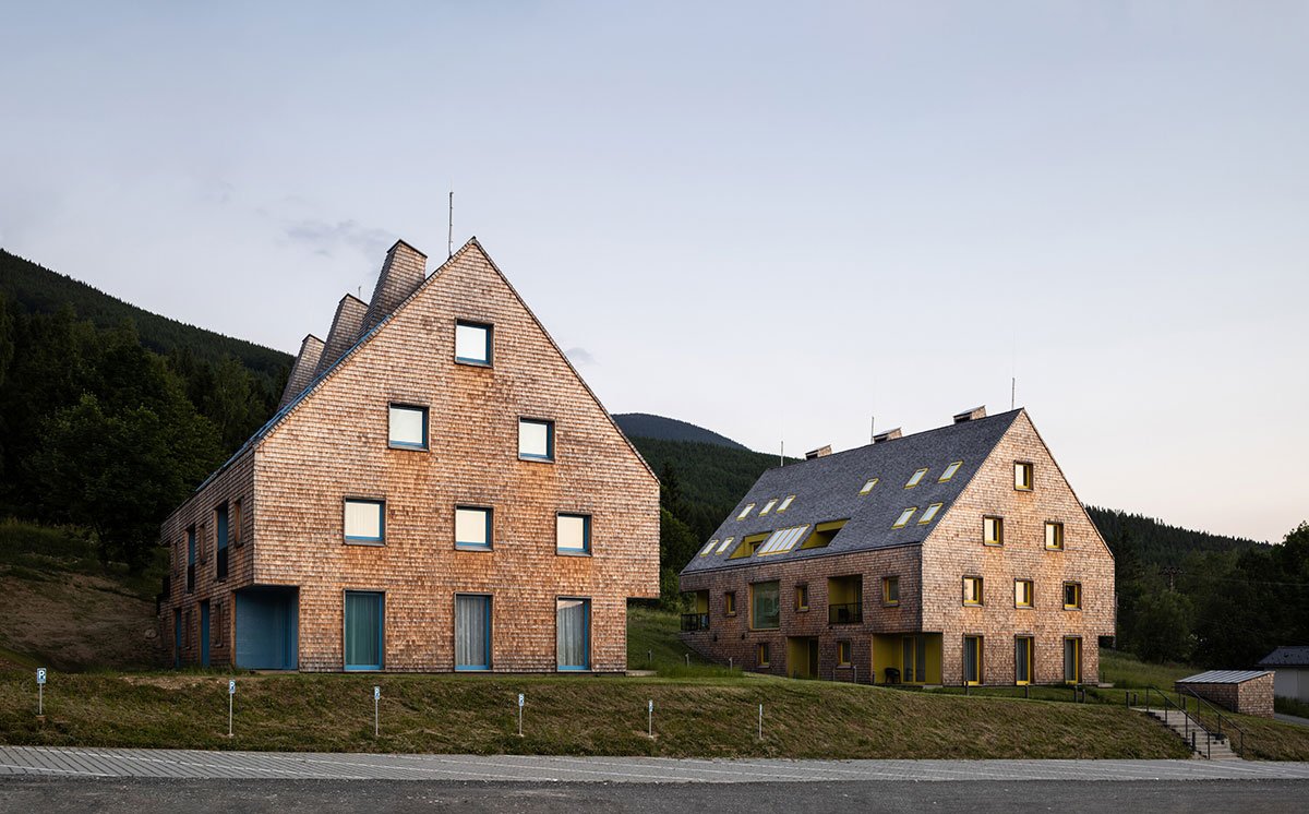 [Text as submitted by architect] The contemporary, almost minimalistically simple concept of the buildings is a freestyle transcription of the traditional morphology of the original architecture of Jeseniky. The classic gable roof completes the basic mass on the rectangular foundations. Both buildings are completely clad with a typical material of local origin – larch shingles in the natural design.