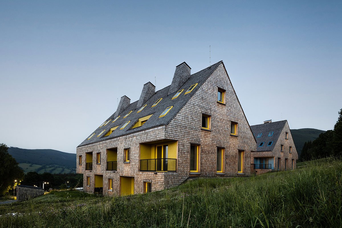 Excerpt: Apartments Filipovice, designed by CL3, is a freestyle transcription of the traditional morphology of the original architecture of Jeseniky, Czech Republic, having the concept of contemporary minimalist architecture. The design relies on traditional materials – the wooden cladding of larch shingles from the local forest, a free paraphrase of the facades of local barns, and gabels of residential buildings.