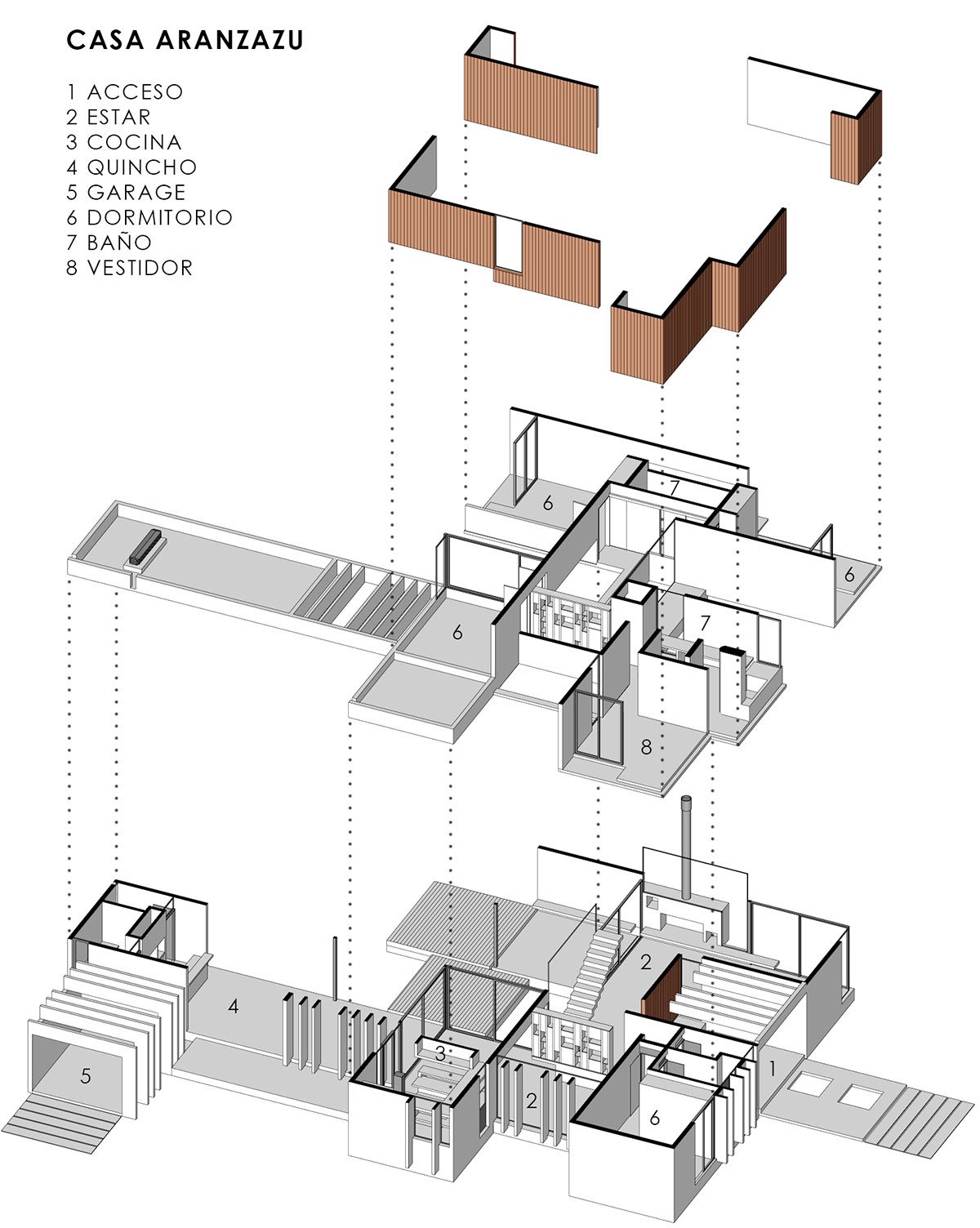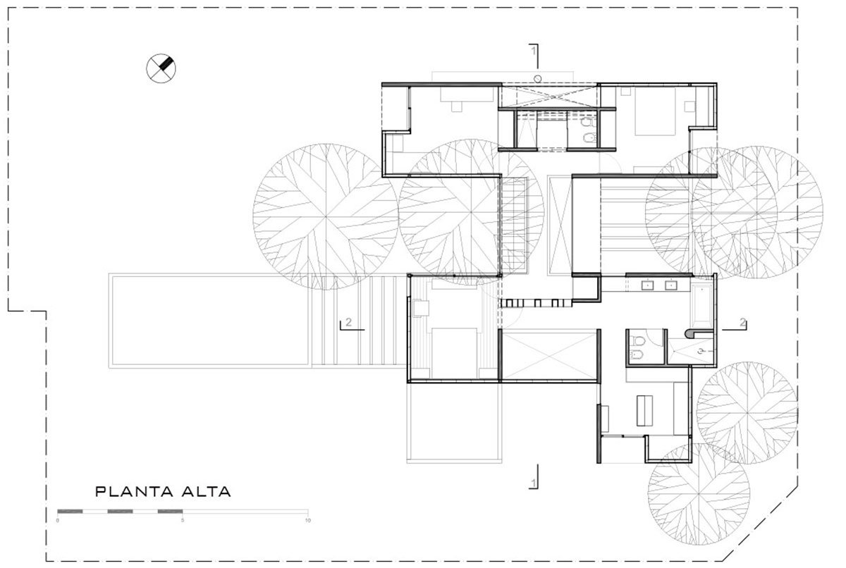 The designers thought then that the house had to develop by accommodating itself in the free holes left by the trees and wrapping them to make them part of the proposed spaces.