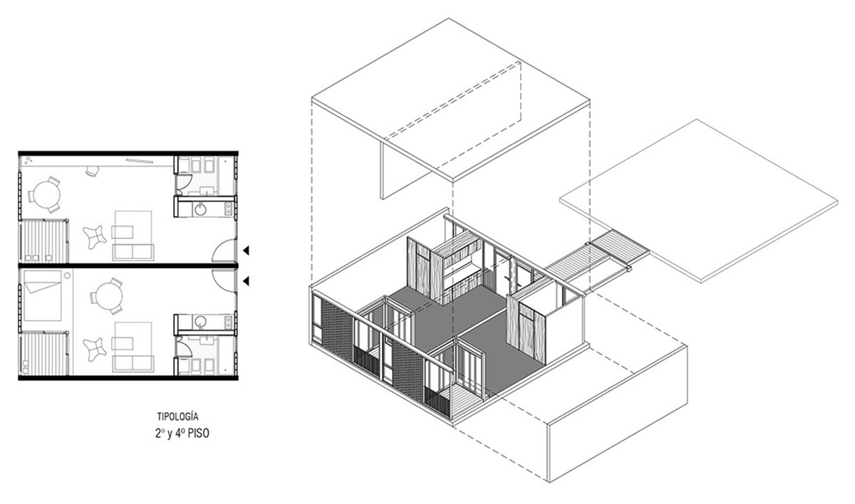 The existence of a patio between the two blocks generates cross ventilation and continuity in the visuals. The private sector of the unit is linked to the external ones. The kitchens and the accesses of the units look towards the patio, suggesting a space where it is possible to be seen and from where you can look, greet and interact. The independence of the compositional elements was intended. The reinforced concrete structure is visible in its entirety and the enclosure of the building consists of prefabricated modules of folded sheet that make openings (empty) and brick support (full).