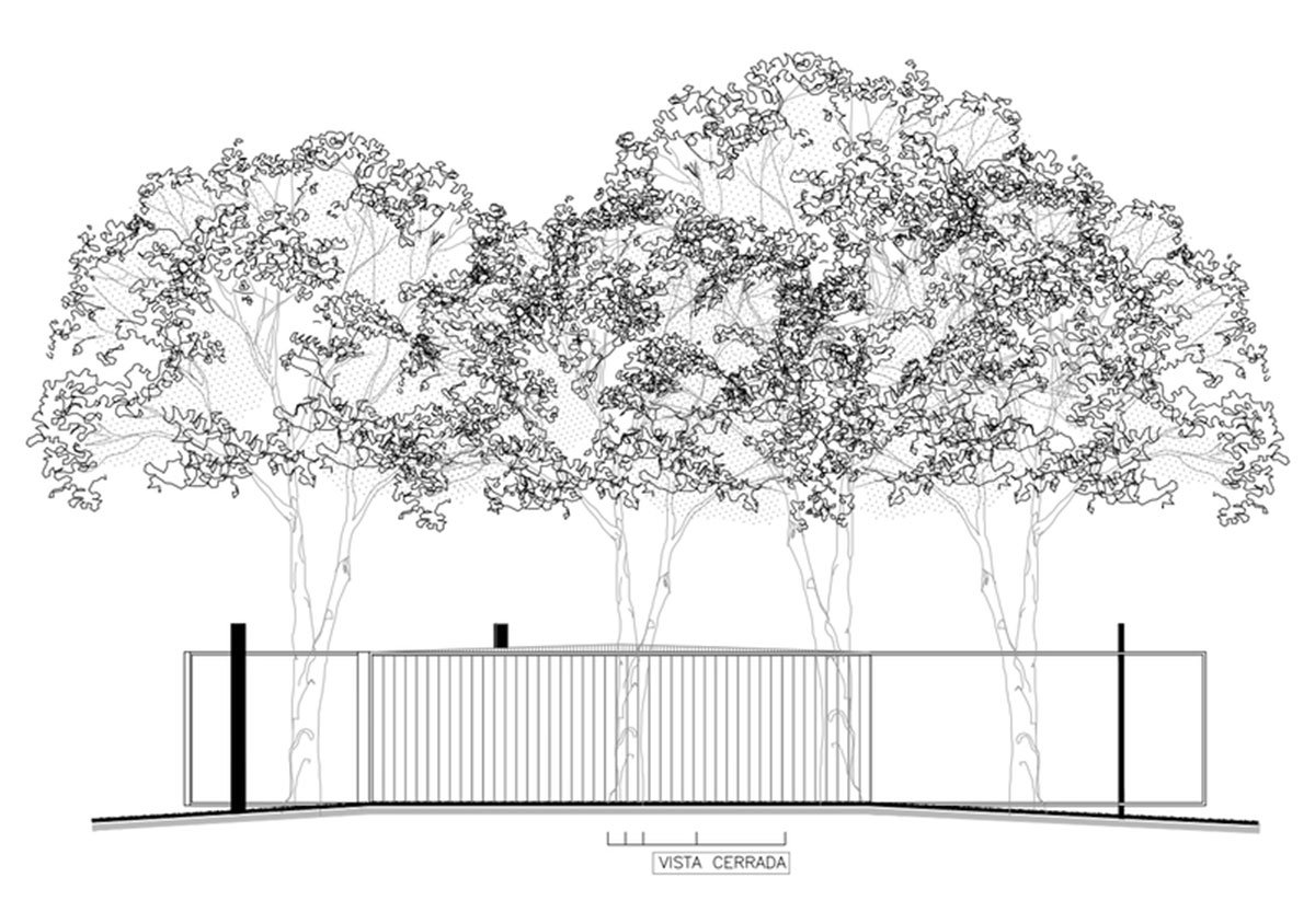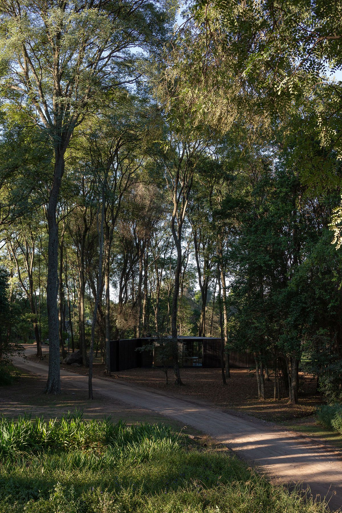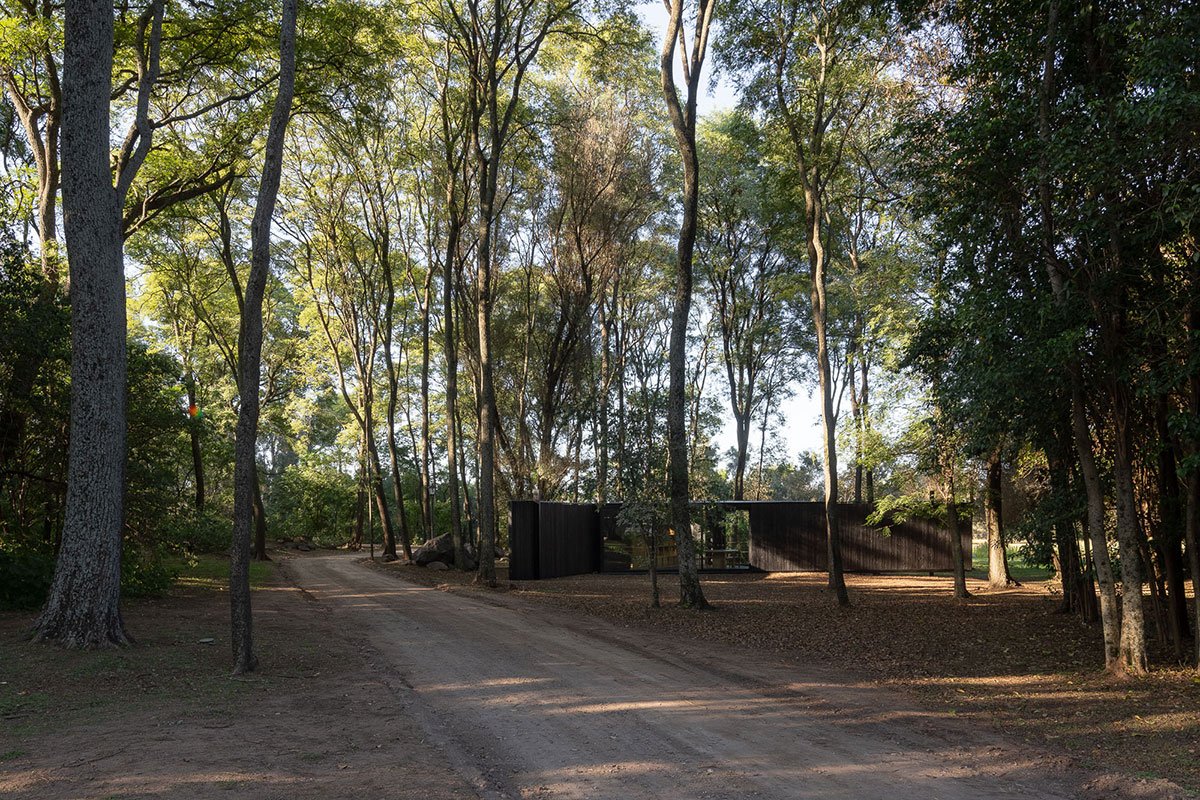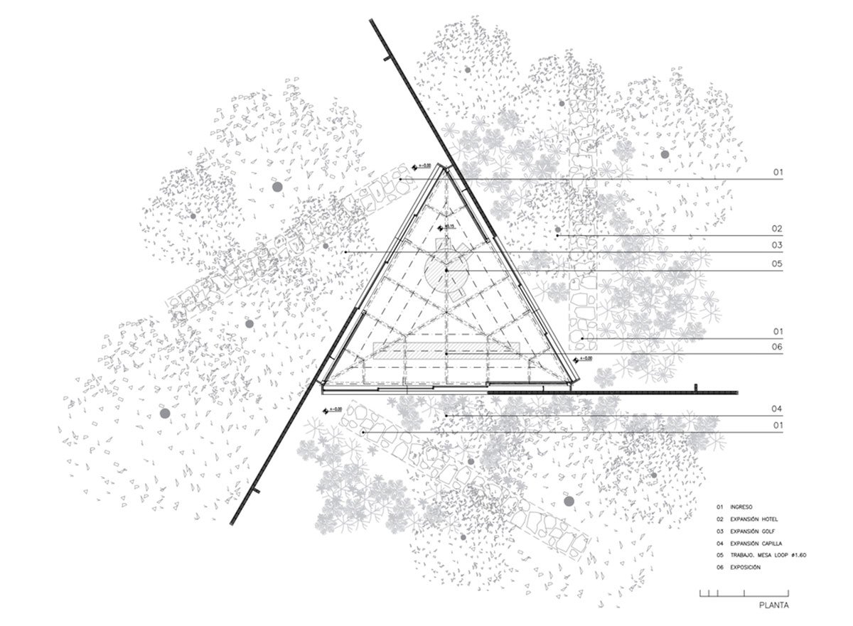 Its strategic location responds to the passage between the old town of Estancia La Paz, now transformed into a hotel, the bar of a golf course, and a panoramic route around a lake. The site conditions determined a volume with three entrances or openings that act as hierarchical circulations instead of a main façade, resulting in its triangular geometry.