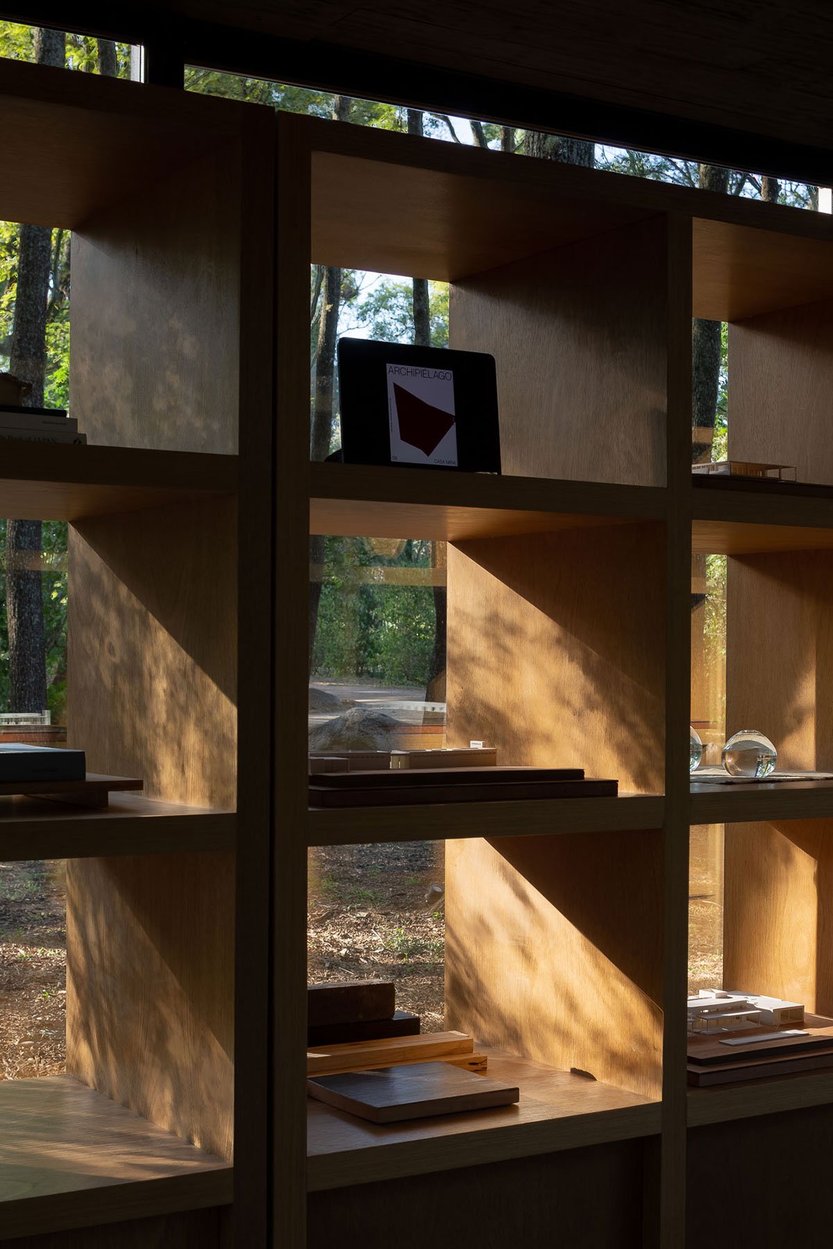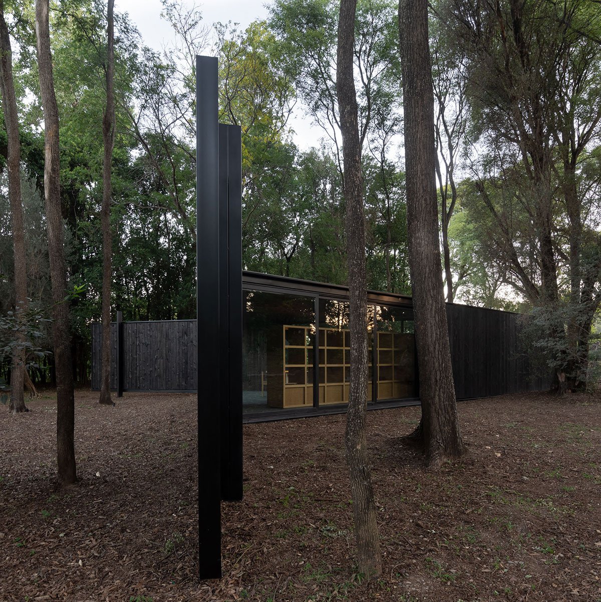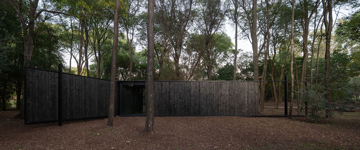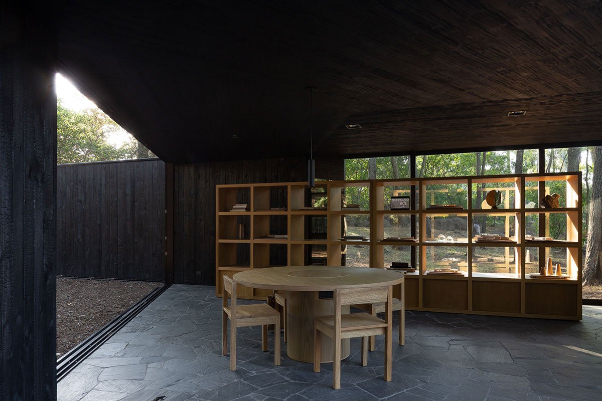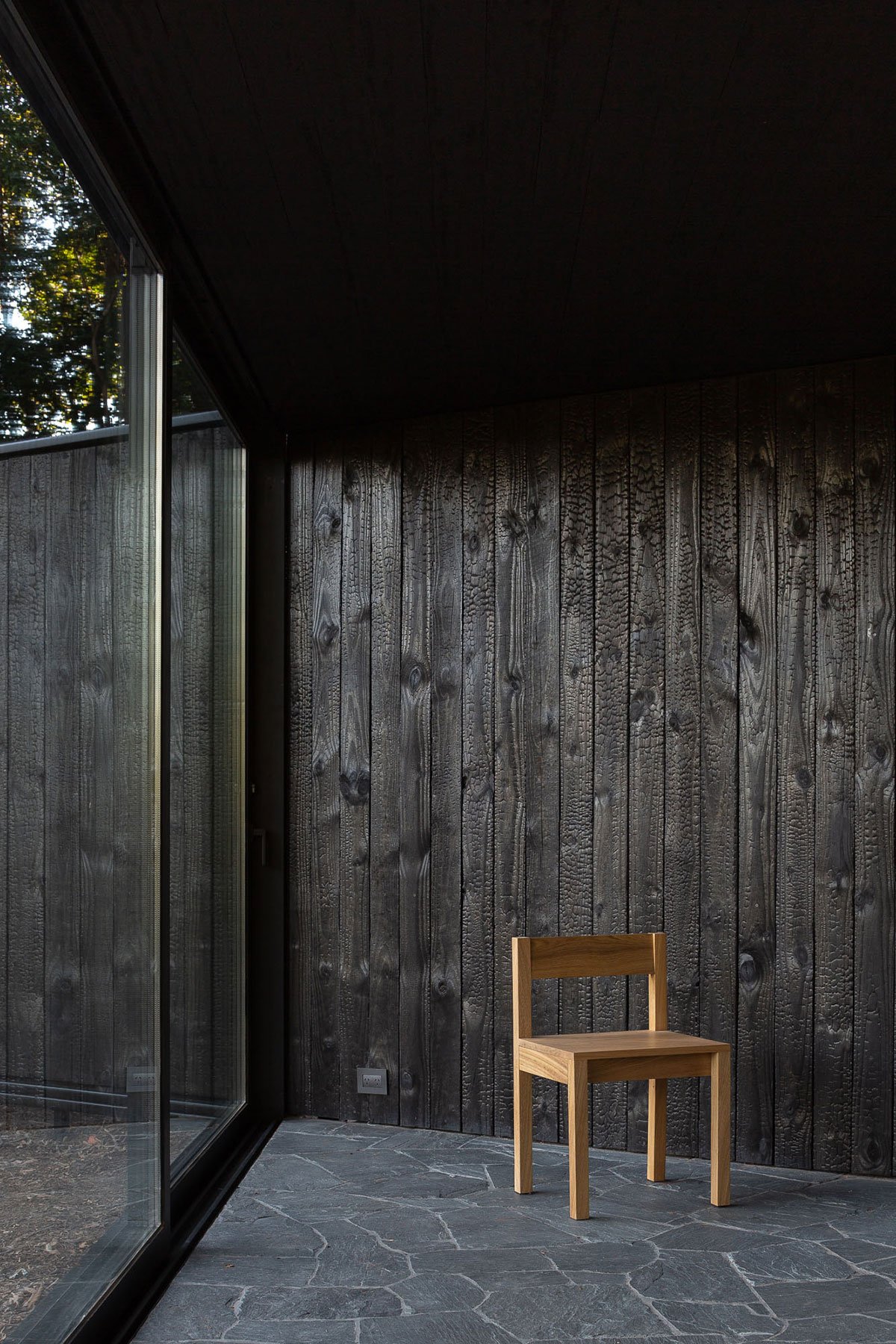 In addition, the predominance of burnt timber cladding gives the building a distinctive colour, texture, and expression that blends in perfectly with the surrounding nature. The interior stone floors and finely crafted woodwork, designed to house the models of the house projects, stand out from the rest of the elements on the site. This situation is only appreciated when the space remains open.
