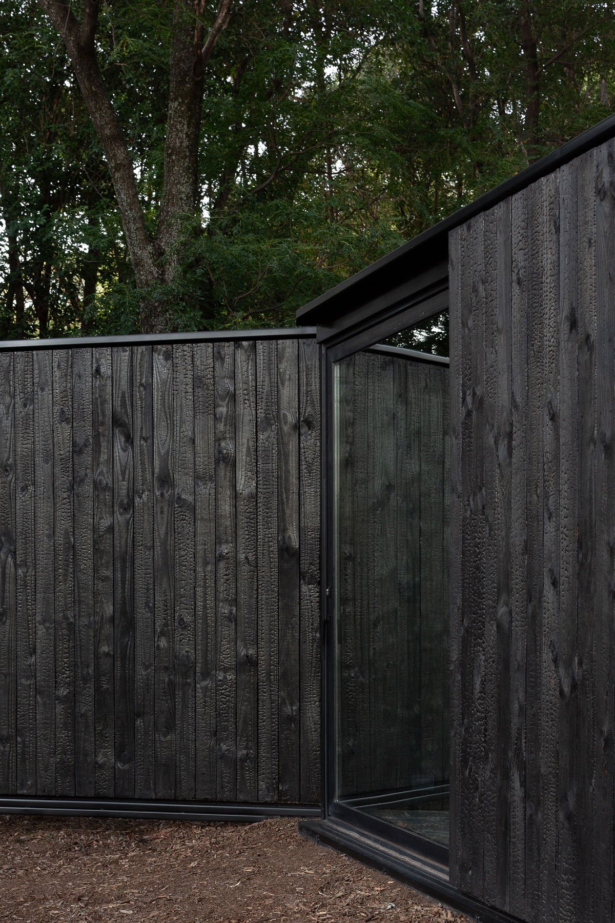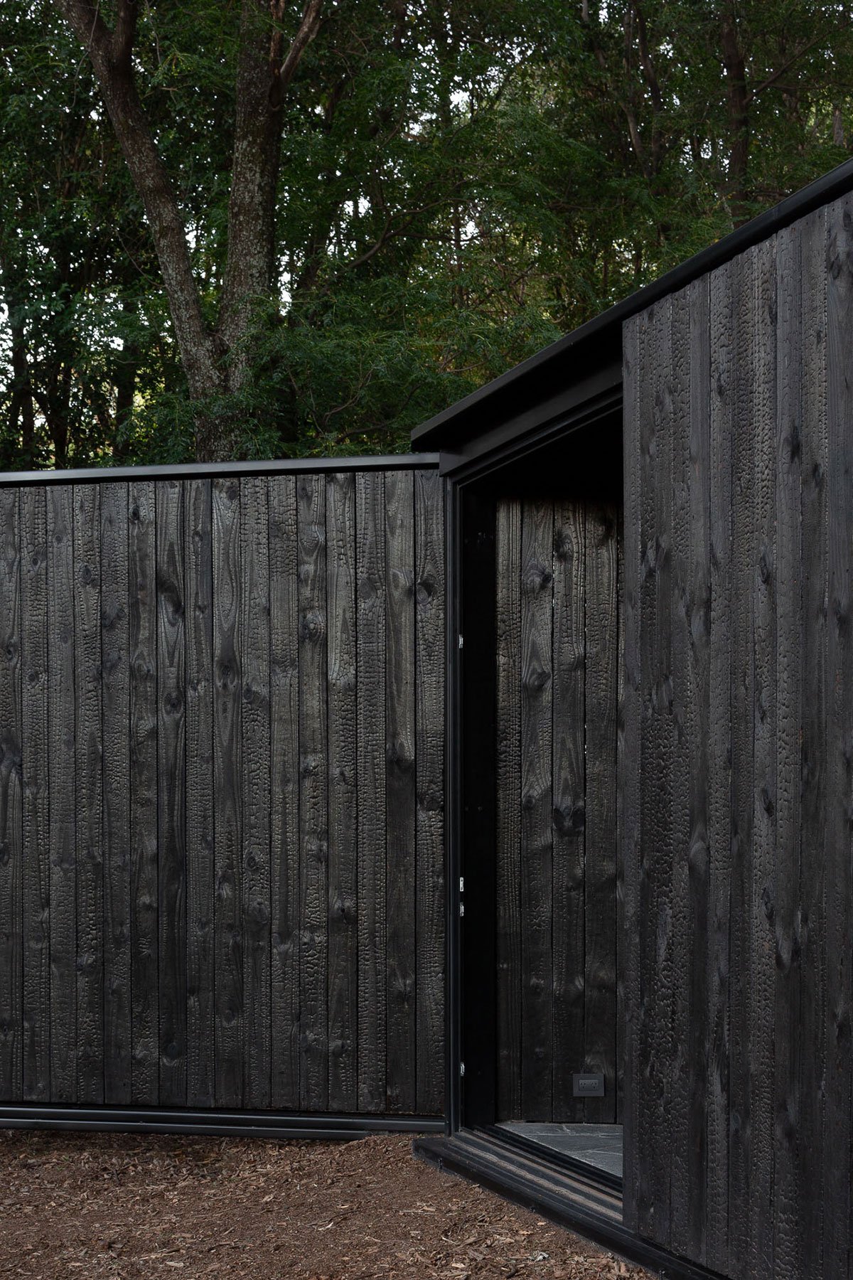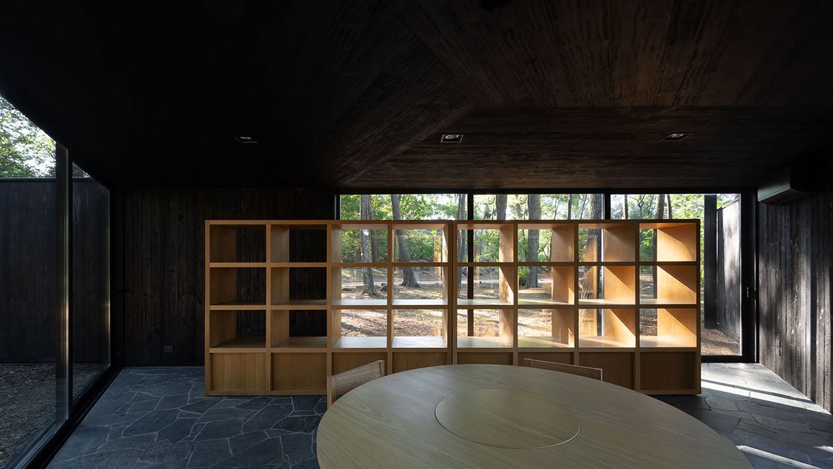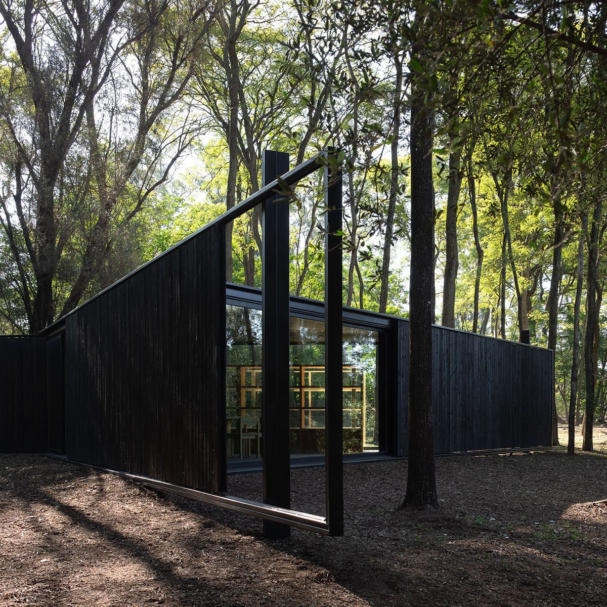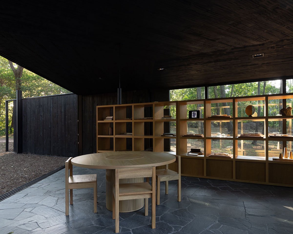 In addition, the predominance of burnt timber cladding gives the building a distinctive colour, texture, and expression that blends in perfectly with the surrounding nature. The interior stone floors and finely crafted woodwork, designed to house the models of the house projects, stand out from the rest of the elements on the site. This situation is only appreciated when the space remains open.