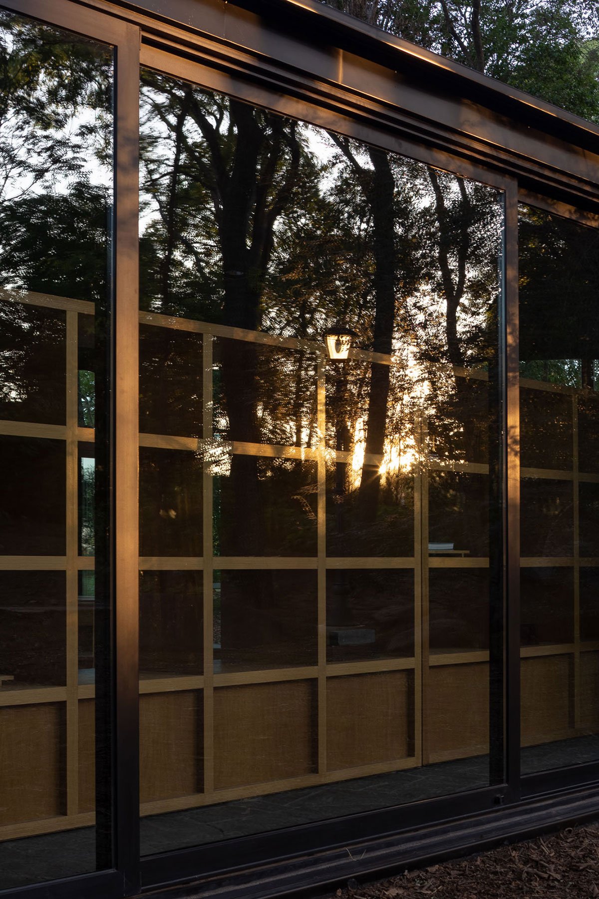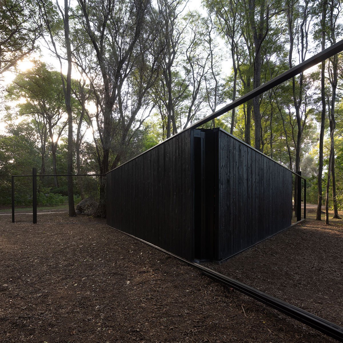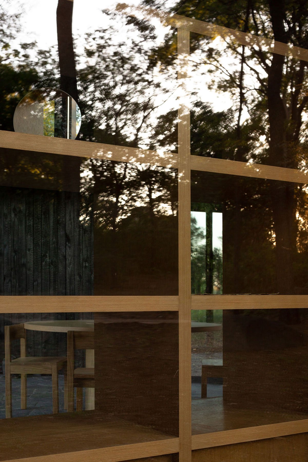Sometimes it functions as a small, blind, anonymous space. At other times, its sliding surfaces move and embed themselves among the trees, inviting one to cross them in all directions, allowing the visual to pass through and integrate with the surroundings. The glass enclosures are hidden behind the blinds when open or enhance the immediate surroundings through reflection when closed. Their quality as objects in the landscape, as points of reference and order of the site, can be traced back to Richard Serra’s sculptures such as ‘Sight Point’ (1975) or ‘Spiral Jetty’ (1970).