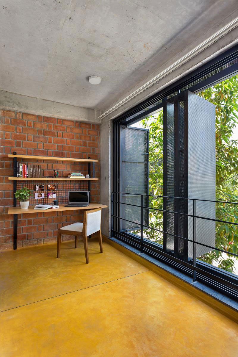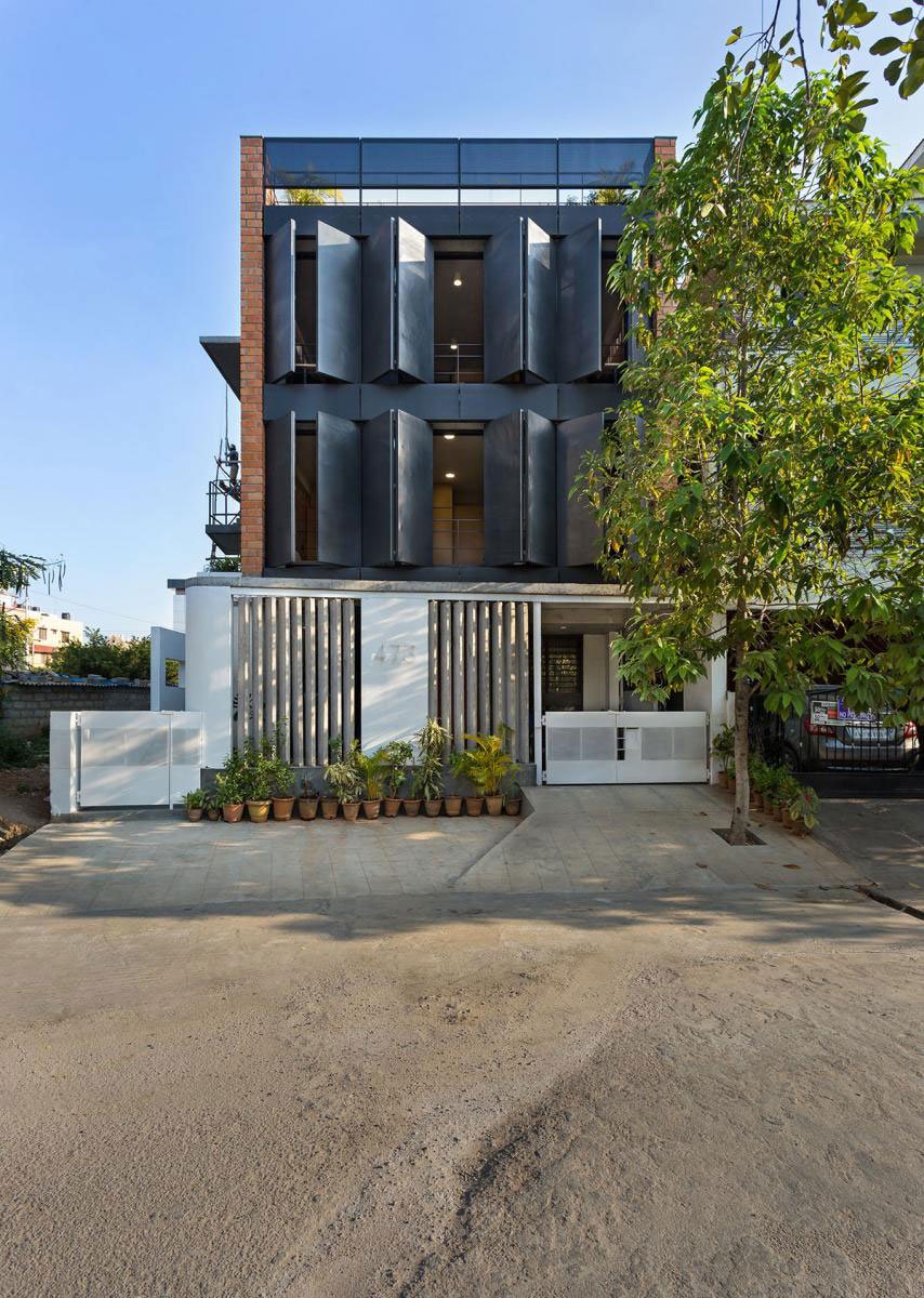 The project was an interesting exercise to understand how the building interacts with the street. The precast concrete fins enclosing a small garden on the NE corner and defining the entrance foyer brings the building closer to the street. The concrete fins, the wire cut brick walls in rat trap bond and the perforated metal sheet sliding folding shutters add certain ruggedness to the building and at the same time bring lightness into the structure. The simple strategy of a single material (perforated sheet shutters) helped in achieving a very minimal yet dynamic façade. The interior design of the office space and the residence is an extension of the architectural aesthetics of the building and at every possible juncture; we have tried to keep the materials in their natural form as much as possible. The furniture units are more like objects kept in the foreground of the building shell from inside.