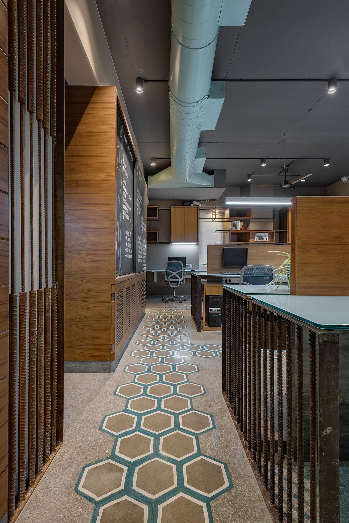 [Text as submitted by architect] This narrative revolves around the development of a four-story architectural structure. The initial three floors were designated for the firm’s architectural offices’ interiors, while the top floor was designated as a studio apartment. Prior to initiating the design process, the designers sought inspiration from foundational elements, akin to revisiting roots, which ultimately metamorphosed into a captivating work of art.