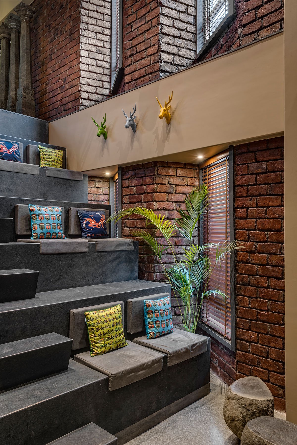 Given the close connection to the construction industry, the interiors mirror the same language, employing elements such as reclaimed construction steel, bricks, timber, concrete, in-situ flooring, and bamboo to complement the design narrative. These materials are harnessed in a manner that preserves their innate textures, as exemplified by the innovative utilization of construction steel for table supports.
