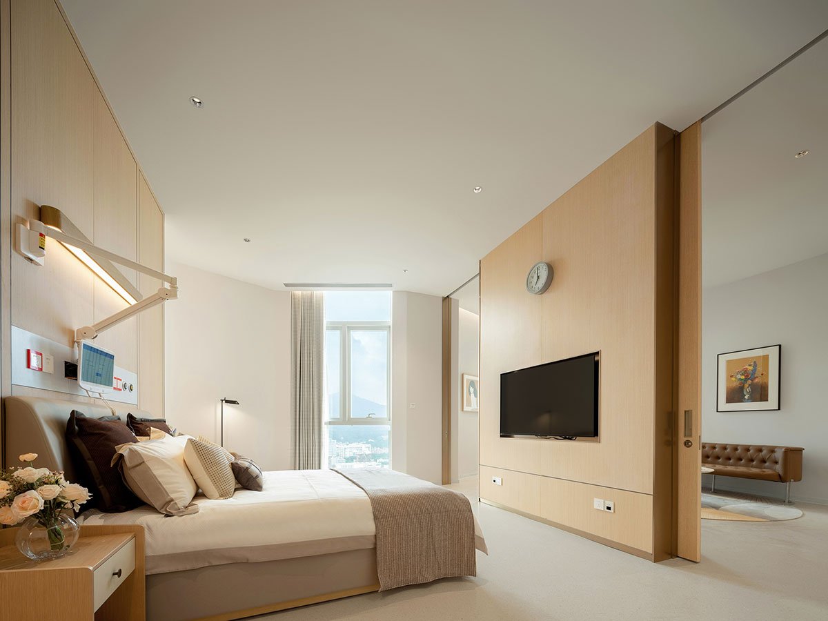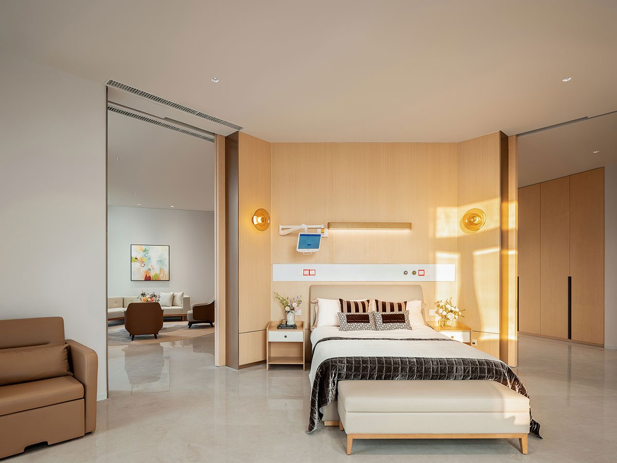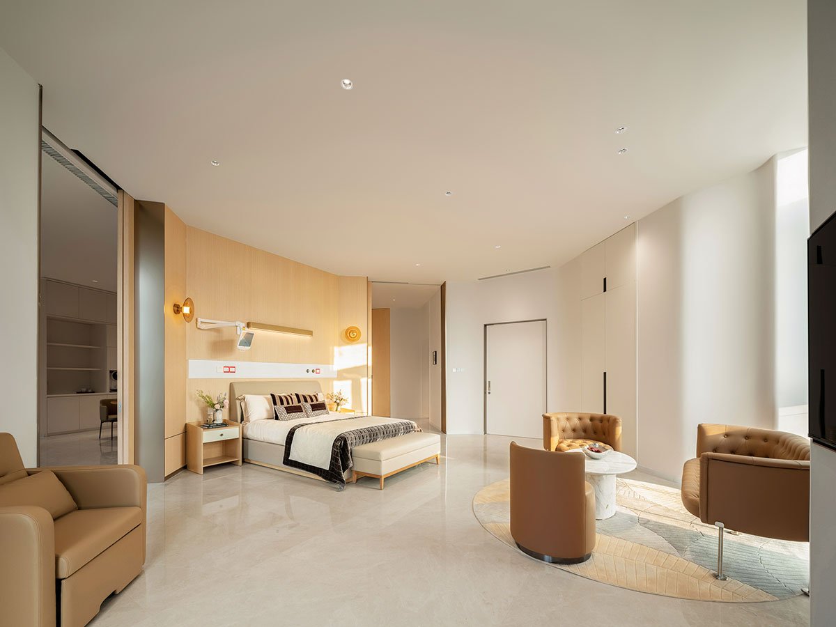The design prioritizes patient comfort and enriches therapeutic environments through: Social and restorative spaces for inpatients (e.g., visiting areas, multi-scenario lounges), the Family-centric health screening experiences, the Efficient circulation linking international services with hospital-wide resources and advanced telemedicine capabilities.