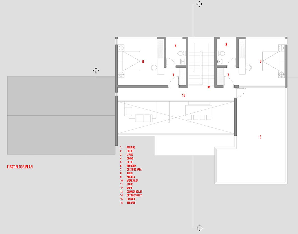 This element serves a dual purpose: facilitating seamless movement throughout the space while simultaneously creating a sense of enclosure for the public area, fostering a comfortable gathering space. Linear planning in this residential design offers the advantage of maximizing connectivity and flow between spaces. By arranging rooms or zones in a sequential layout along a central space, linear planning creates clear sightlines and promotes easy movement.