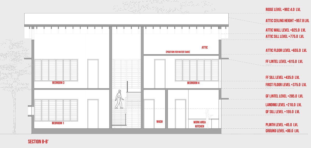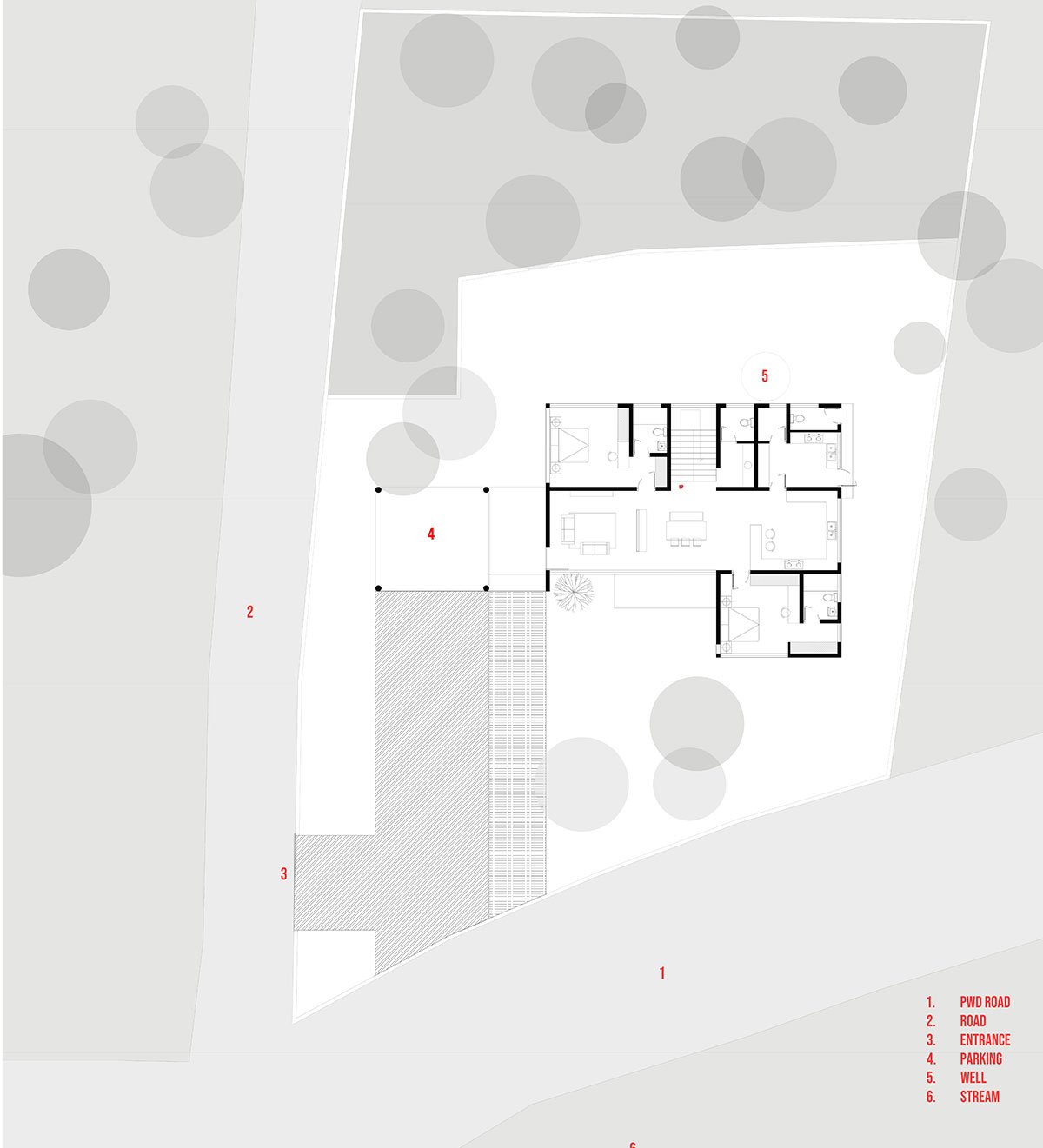 Site context plays a crucial role in shaping the design and functionality of a residential building. It acts like a blueprint, influencing various aspects of the structure and significantly impacting the living experience it offers. Perched upon an elevation from the main road, the building enjoys a distinct advantage in terms of privacy. This elevated position effectively shields the residents from prying eyes and unwanted sounds, fostering a sense of seclusion from the public domain and creating a tranquil haven within the home.