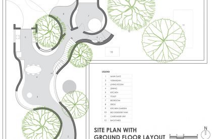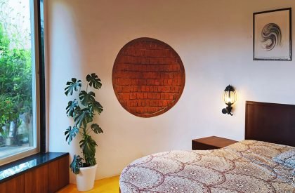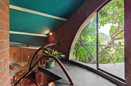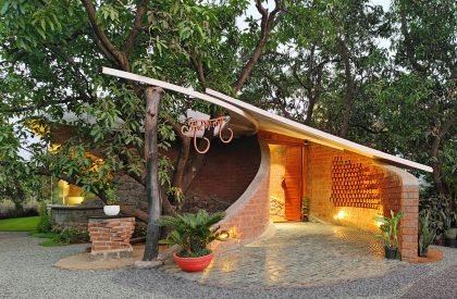 The design concept centers around organic curves that delicately embrace five mango trees on the site. An open floor plan and interconnected spaces offer versatility and adaptability, with each area seamlessly transitioning to the next along gracefully curved walls, thus forging a unified and uninterrupted spatial ambiance. Upon entering, a curved brick jali evokes curiosity, leading to a captivating spatial shift into multifunctional living and dining zones. The dining space effortlessly merges with an open kitchen, while the communal areas maintain an understated yet utilitarian aesthetic. The upper floor, housing private quarters, maintains a consistent soothing textural palette, in continuity with the ground floor.