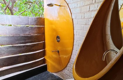 A recycled glass bottle wall on the ground floor, adjacent to the staircase, introduces a playful infusion of daylight, orchestrating an interplay of light and shadow that enriches the earthy color palette. Complementing the structure, inbuilt ferrocement furniture exemplifies a harmonious blend of functionality and design. This approach of ‘selective detailing’ generates a juxtaposition with the blue-toned ceiling, engendering contrast and harmony.