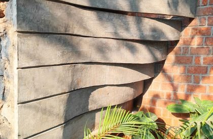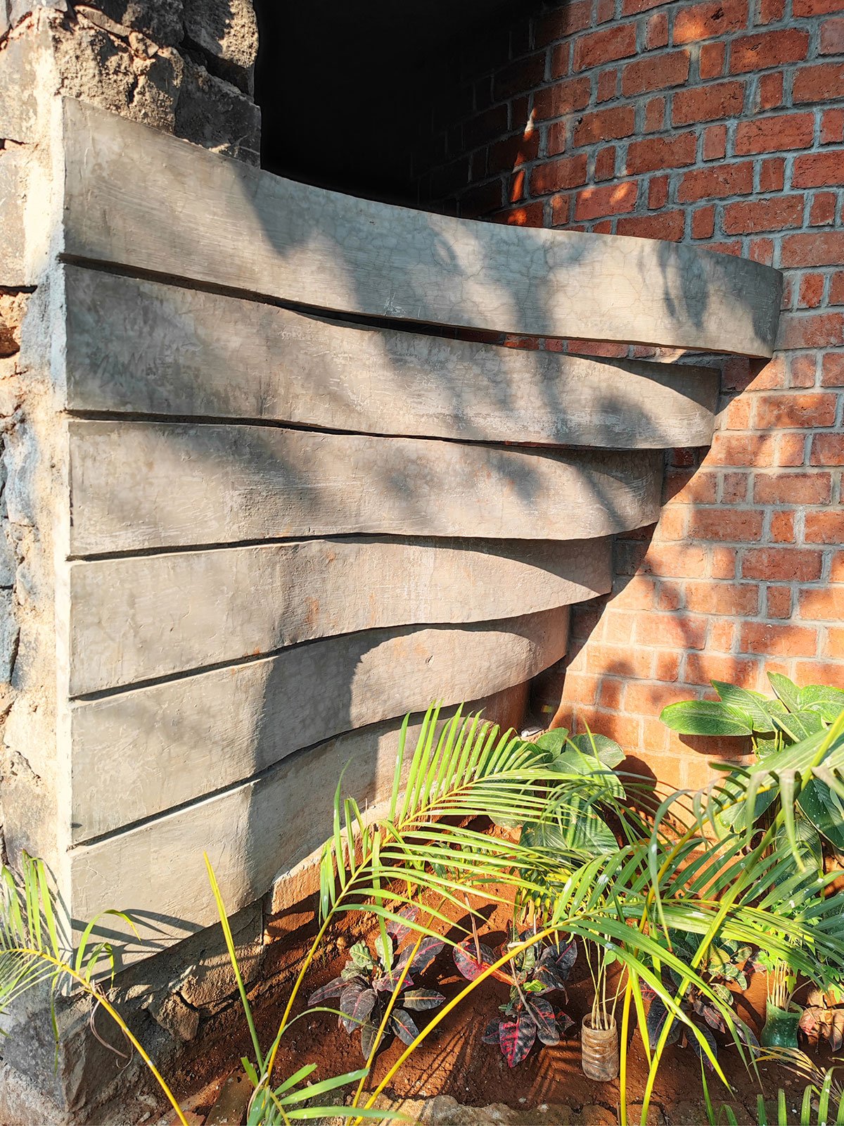 The ferro cement roof, oriented towards the north, is meticulously designed to embrace the existing trees, whose expansive canopy provides natural shading, negating the need for air conditioning. Earthy hues are imparted by the utilization of materials like brick and stone, thoughtfully combined with unique spatial arrangements. The adoption of rat-trap brick bonds not only enhances material efficiency but also contributes to the brick structure’s insulation. The expressive potential of brick is harnessed through textured wall treatments, corbelling, and distinctive apertures, wherein light and texture collaboratively emit a warm ambiance.