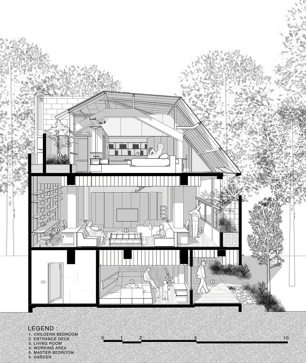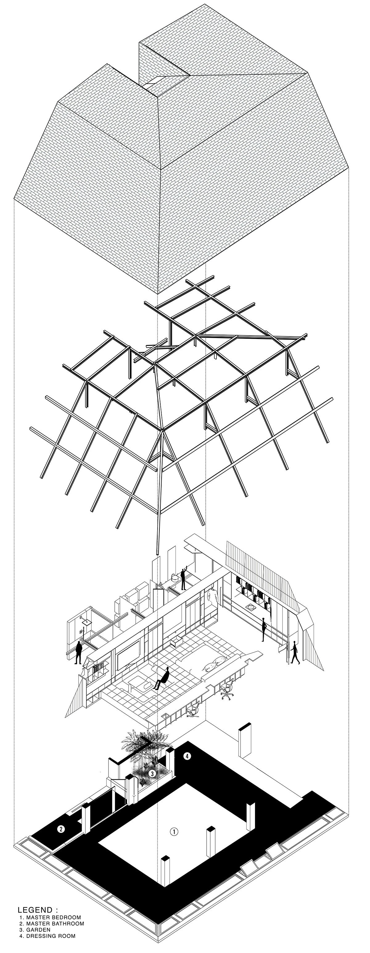 [Text as submitted by architect] What if the attic and roofing characteristics become the identity and façade of a renovated house? ‘Attic above garden’ consists of four introverted volumetric masses that float above a lush landscape, creating inverted spaces between the volumes.