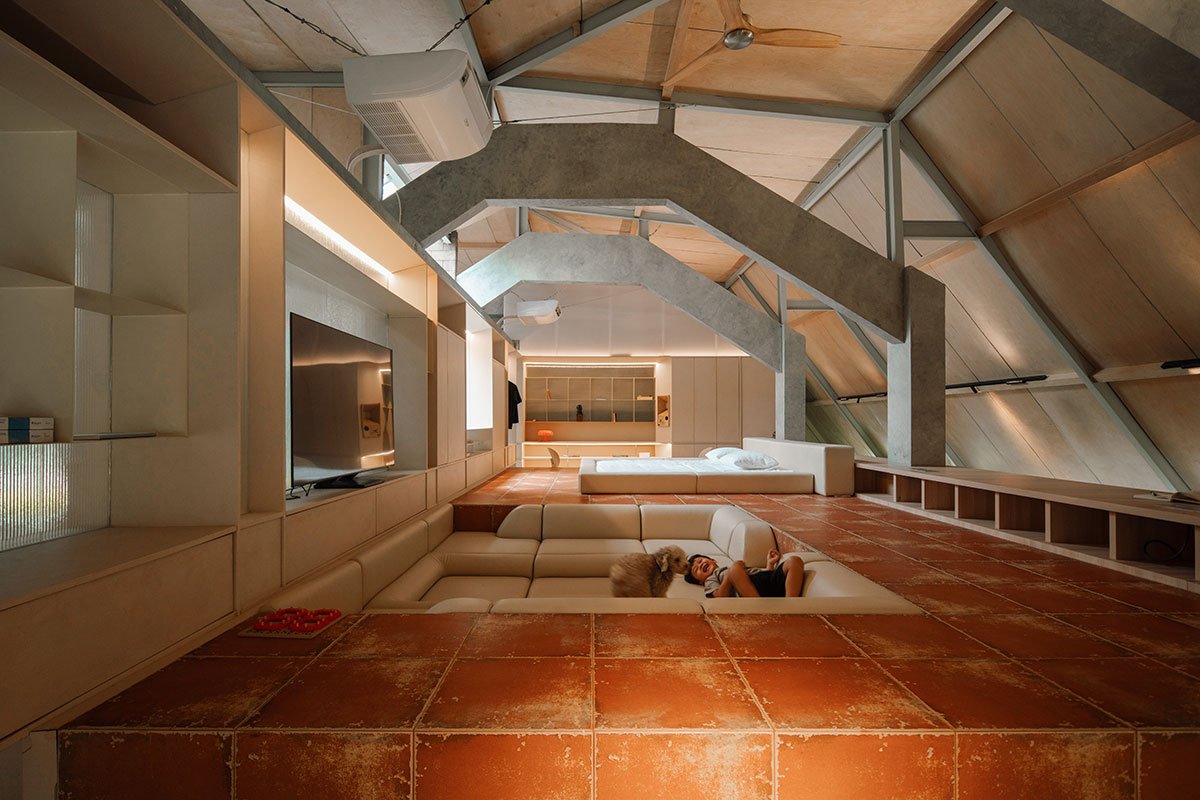 Excerpt: ‘Attic Above Garden’ by RAD+ar explores the idea of turning attic and roof forms into the defining identity and façade of a renovated house. Four floating volumes above a garden create a balance of openness and intimacy, blending architecture with nature. The open layout, honest materials, and fluid spatial design support adaptable living, where light, shadow, and structure shape a quiet yet expressive home.