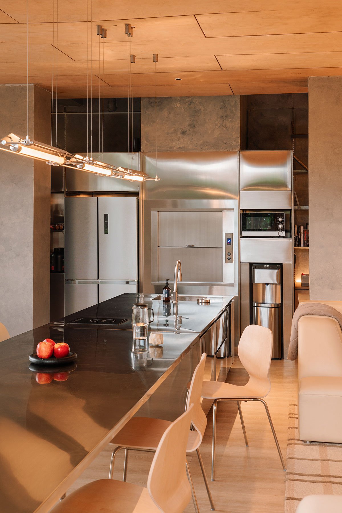 The materials employed are honest and traditional, featuring monochromatic colors and textures throughout, with the exception of the stainless-steel pantry area to constitute the background for the existing birch plywood roof ceiling. The attic is dominated by a consistent light brown hue, which harmonizes with the natural colors of the surrounding landscape that intersect through each floor. Both staircases connecting the floors are discreetly integrated, distinguished only by a darker color and porous texture. The remainder of the house showcases lighter colors and smooth surfaces, with the bathroom offering a surprising burst of more intense color.