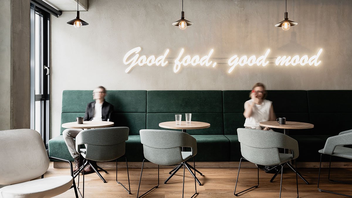 The chillout room is dominated by bright and warm colours relating to its function. Wallpaper with a floral motif, hand-moulded brick tiles in white, a wood-coloured openwork wall with light grey PET panels build a warm, friendly atmosphere here. The social area, which is used for meetings, conversations and dining, is similarly arranged. Strong colours of green and grey dominate here, with delicate colour accents of free-standing furniture and ledon on the wall. All this is intended to guarantee ideal working conditions, providing a homely atmosphere in an inherently dynamic office.